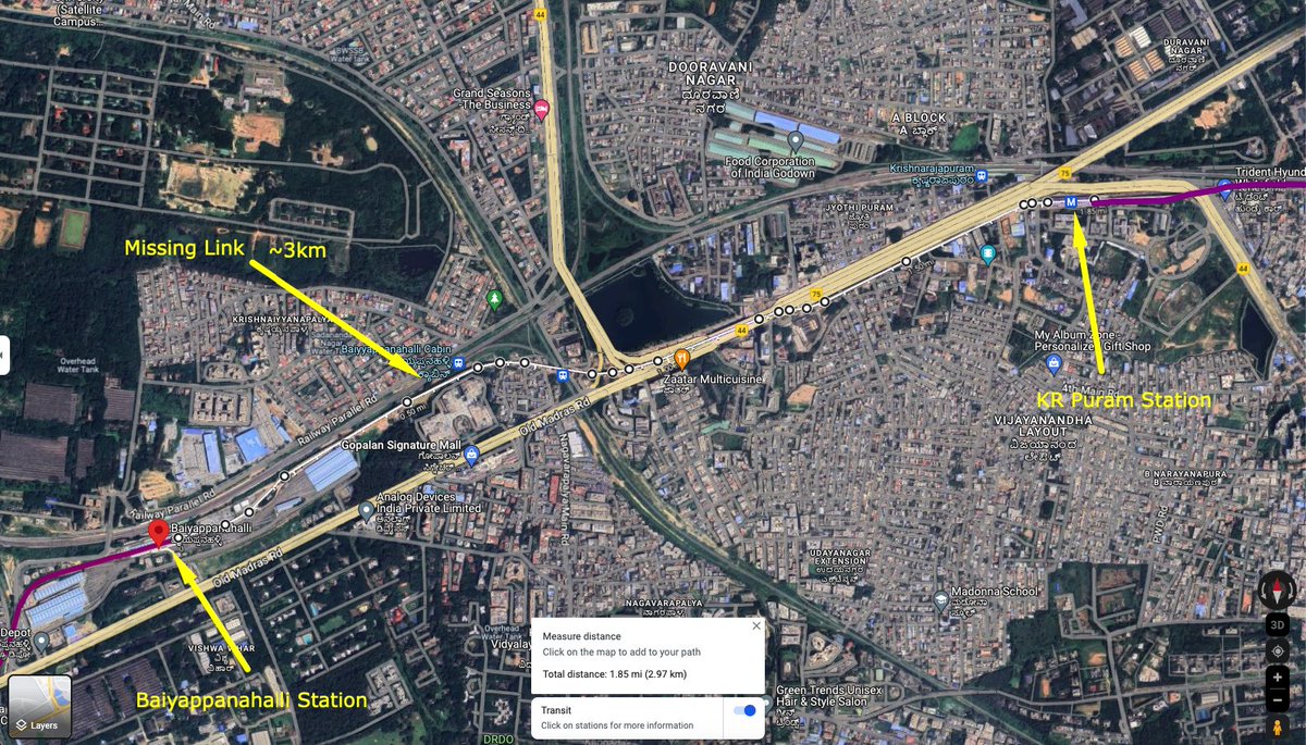 Google satellite imagery shows this portion is yet to be completed. The current low patronage on the KR Puram-Whitefield section shows the importance of completing critical sections of a metro network otherwise it drastically reduces the utility of the line.