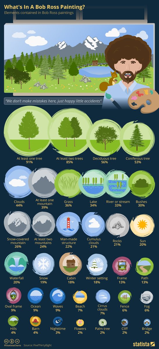 19. Walt Hickey, Resim Sevinci’nin bütün bölümlerini analiz etmiş ve Bob Ross’un resimlerinin %91’inde ağaç, %44’ünde bulut, %39’unda dağ, %36’sında otluk, %34’ünde göl, %33’ünde akarsu, %20’sinde güneş, %19’unda kar, %18’inde kulübe, %9’unda okyanus çizdiğini tespit etmiş.