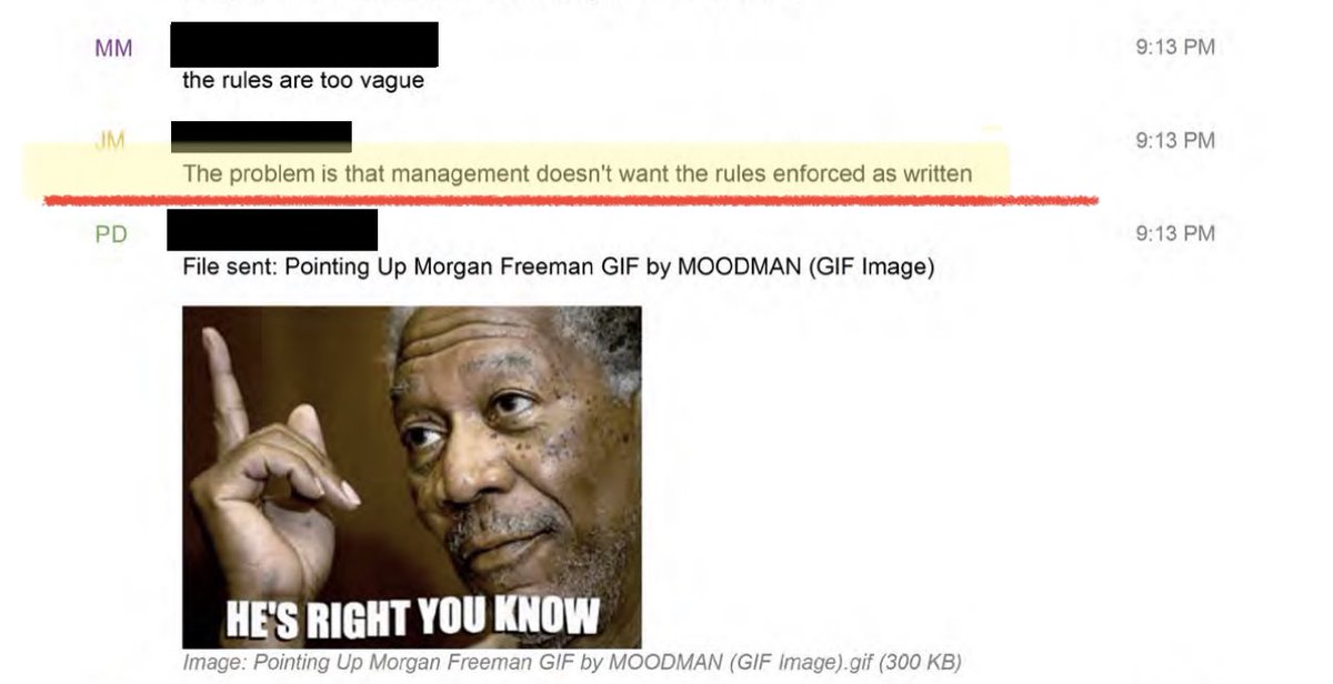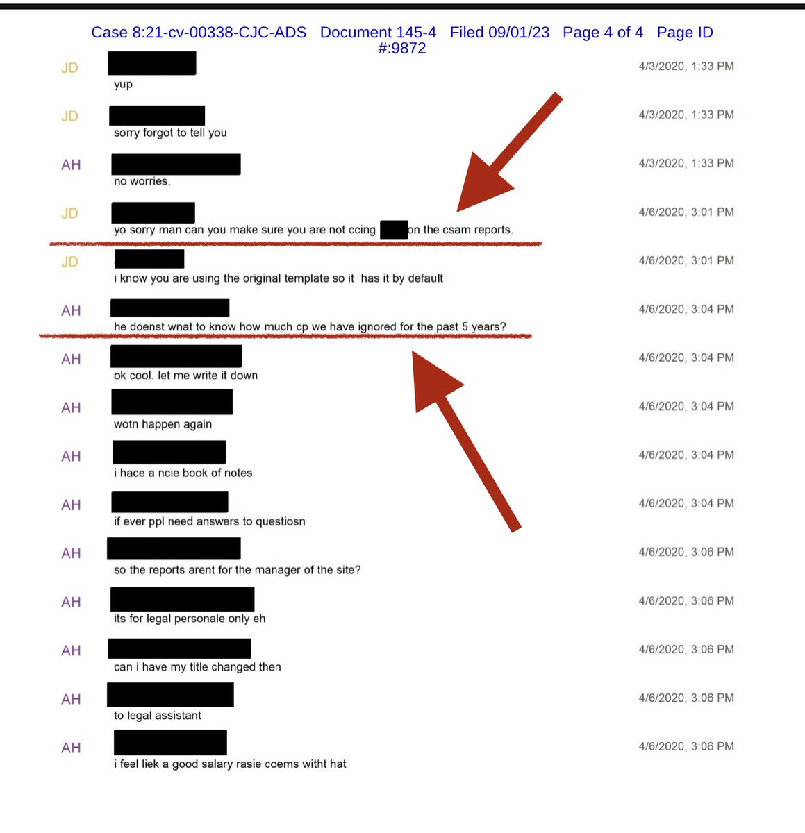 -Text messages also show employees saying that management instructed them to stop sending notices of child sexual abuse on P*rnhub to management, presumably so they could claim ignorance.