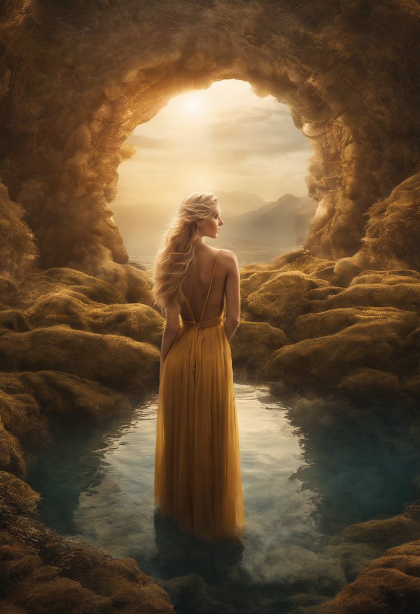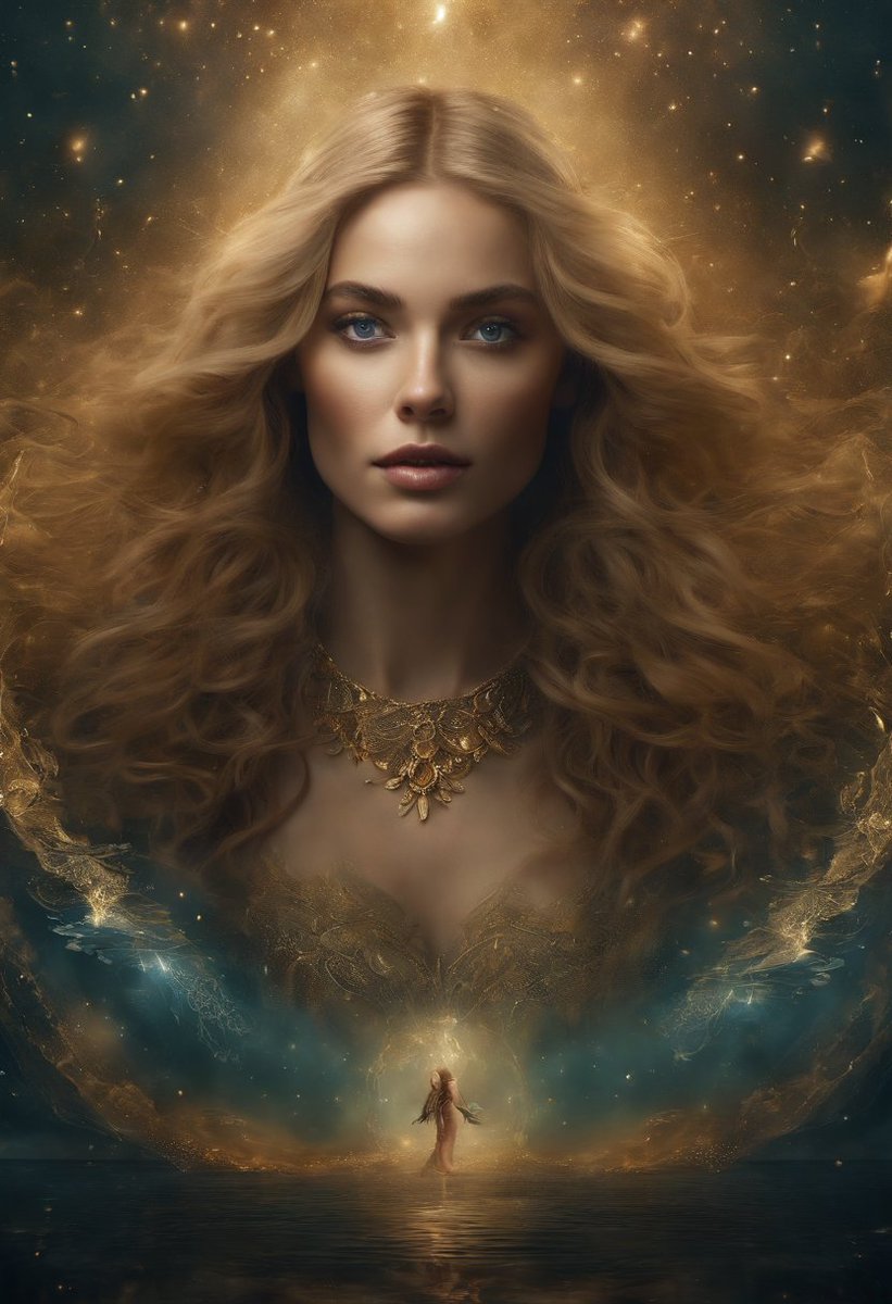 Prompt(d):In a surreal, fantastical world, our stunning woman with extra long wavy blonde hair possesses eyes that seem to hold the secrets of the universe.She stands amidst floating islands in the sky,her hair cascading like a waterfall of gold. magic and wonder.