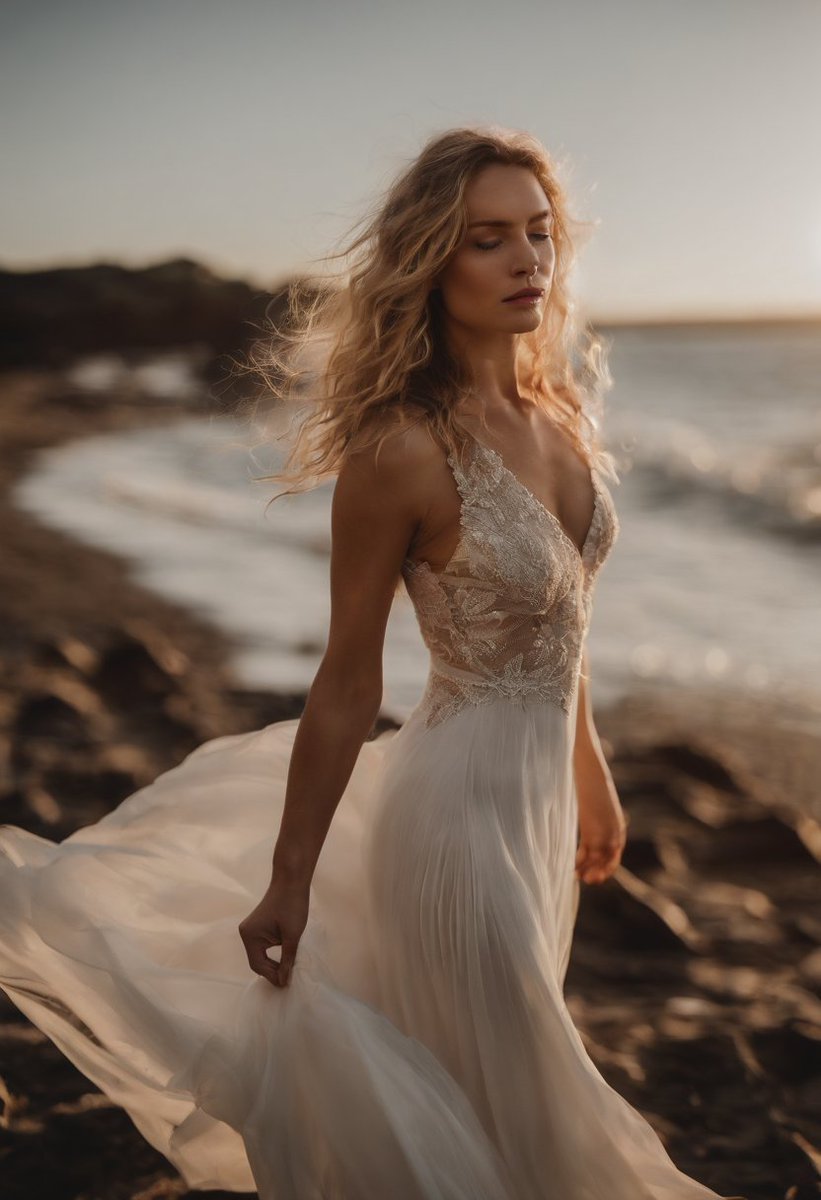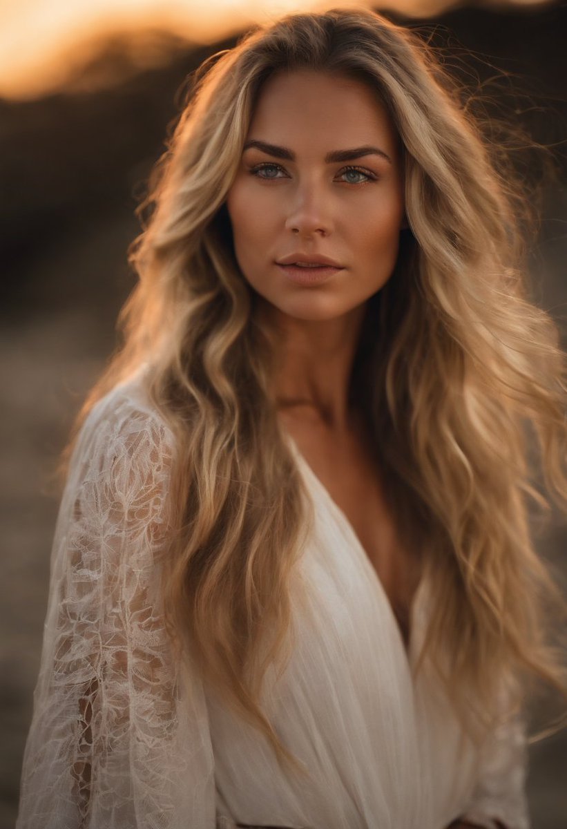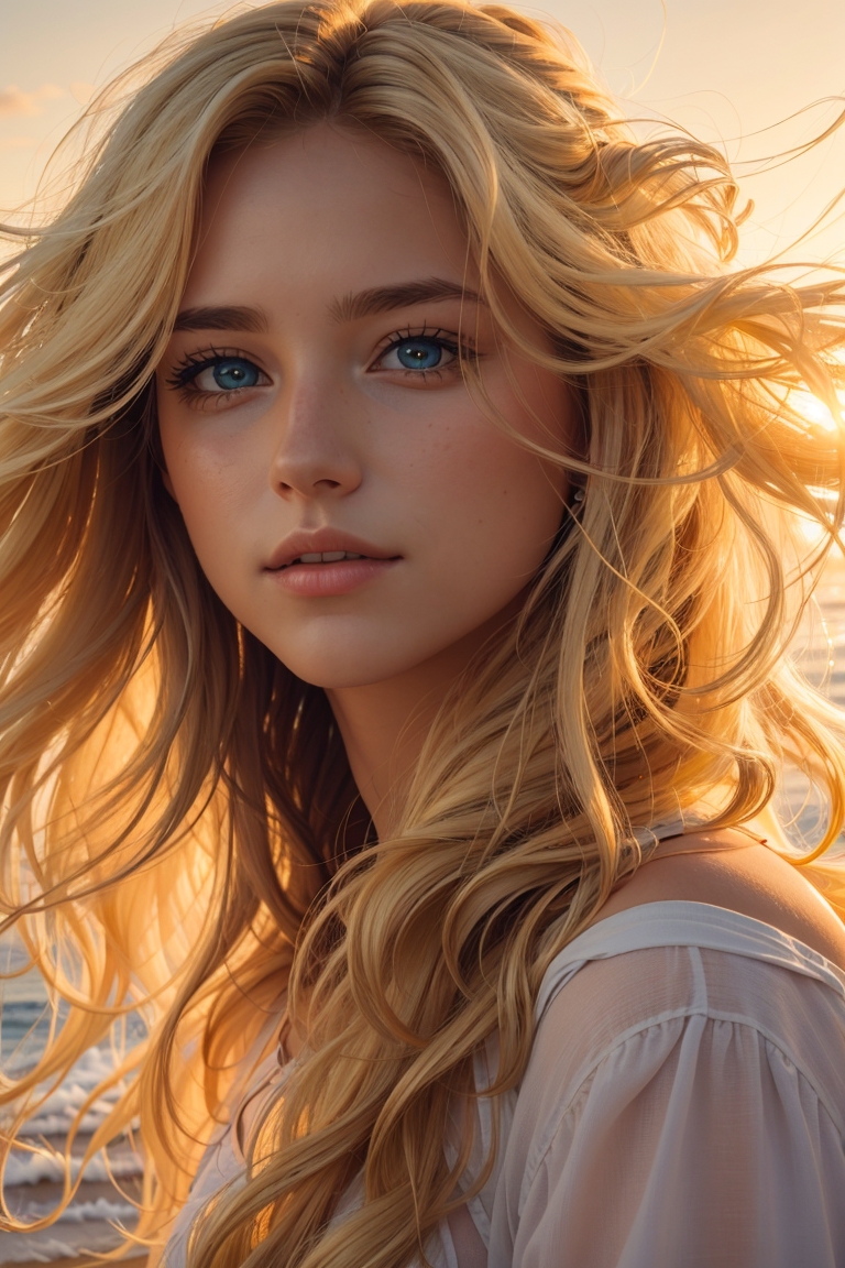 (c) captivating woman with extra long wavy blonde hair and mesmerizing eyes stands on a beach during a vibrant sunset.Her hair dances in the breeze, and her eyes sparkle in the warm, golden light. The scene is filled with sounds of crashing waves, romantic atmosphere