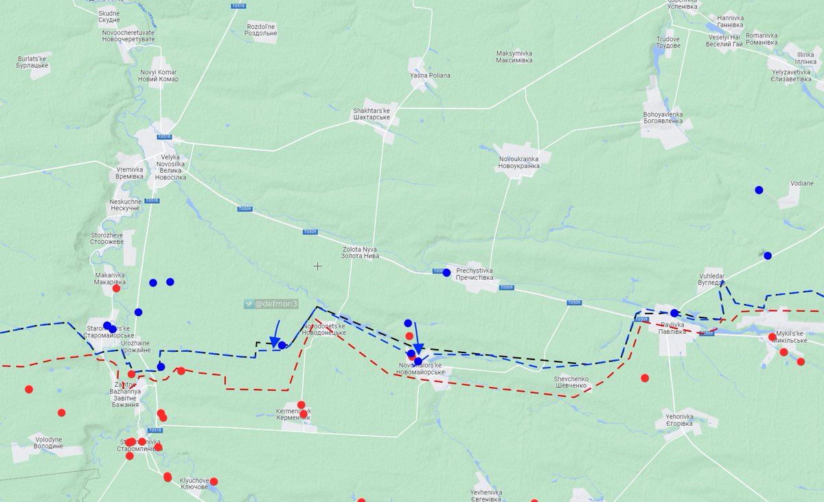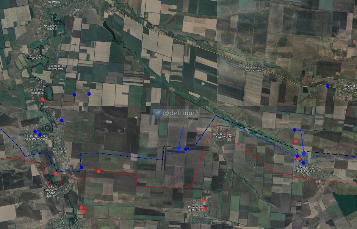 This morning multiple RU channels reported a UA offensive around Novodonets'ke, Novomaiors'ke and yesterday there were reports about activity around Shevchenko.