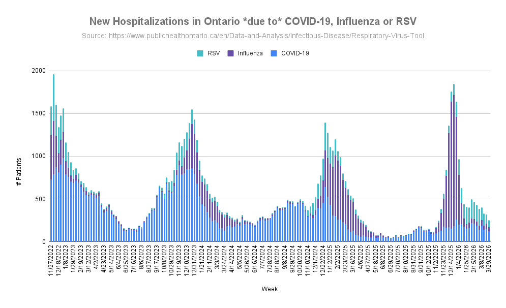 What about today, with lower circulation happening more recently and not the huge waves seen in the past, is anyone even being hospitalized for COVID anymore? The most recent update (week of March 8, 2026) there were 188 people hospitalized in Ontario due to COVID. 3/
