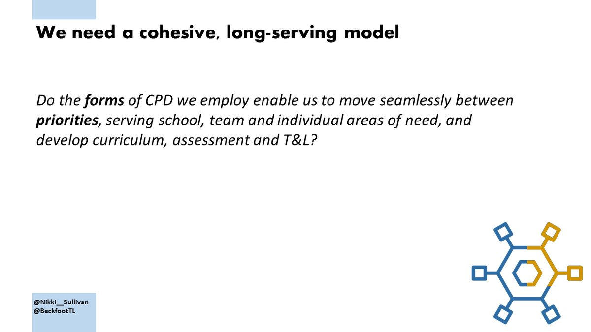 “Teaching is complex. Leading is complex. Creating a CPD model which feels cohesive and uncluttered is complex – and engaging in the complexity is how we ensure it lands simply and effectively.”