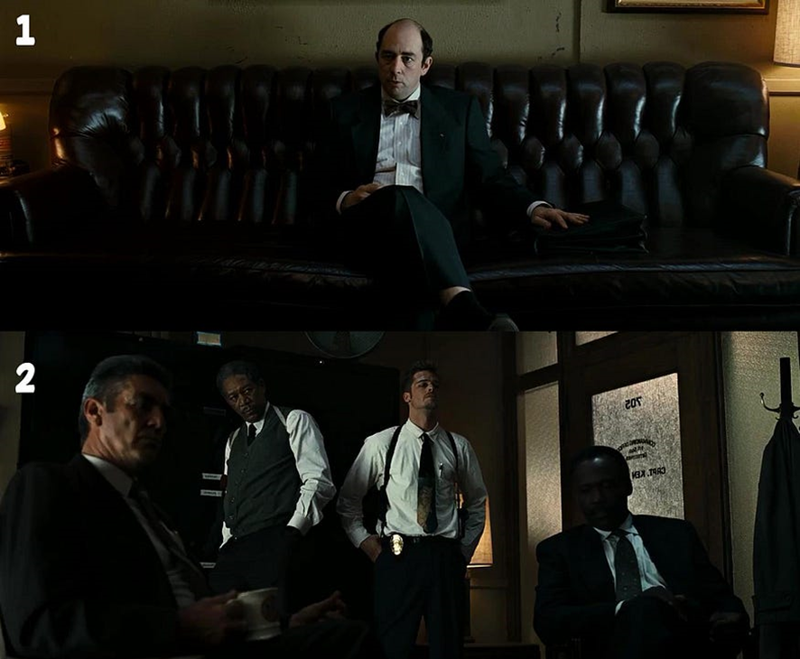O trabalho de Fincher e Darius Khondji em Seven é fora de série, como aqui, em que a maneira como eles enquadram os policiais e o advogado do psicopata já mostra quem está confortável e pressionado nessa situação