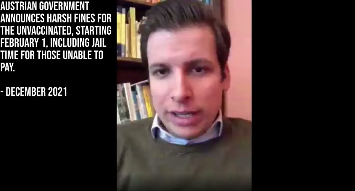 “An Austrian newspaper published the rules the government wants to introduce on first of [February] already here in Austria. Those rules say that if you’re not vaccinated, you can get fined up to 2000 euros each time you’re caught unvaccinated. This can mean, and this is explicitly being said so that you can also get fined more than once a day, or three times, four times, five times if you’re unvaccinated. If you refuse to pay this, the government wants to put us into a separate prison which has to be created for unvaccinated people up to one year.”
