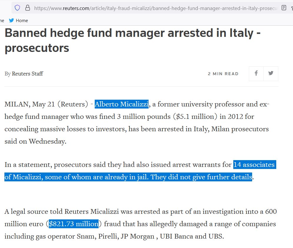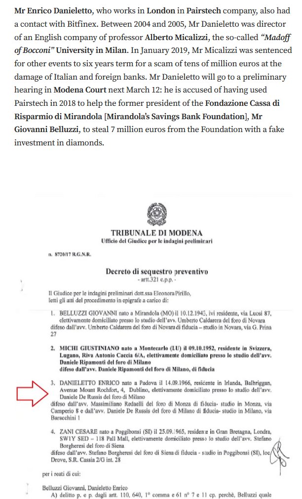5/ Danieletto founded DD Capital Mgmt with the infamous professor Alberto Micalizzi, convicted for major financial fraud ($840 million) and is accused of having used his company to help Giovanni Belluzzi stealing millions from Mirandola’s Savings Bank Fnd. with a fake investment.
