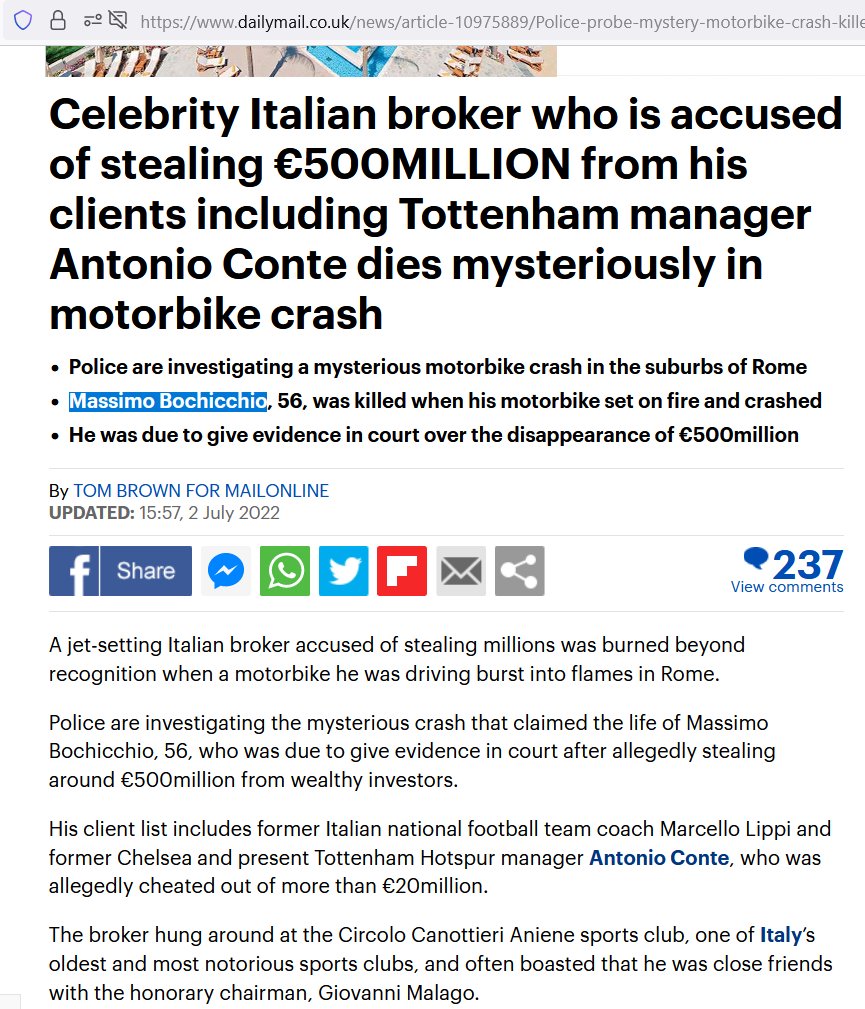 8/ Cantarini was most recently part of Tiber Capital, together with Massimo Bochicchio, a celebrity broker accused of stealing €500 million who recently suspiciously died in a motor accident. His wife mentioned he was threatened by “ugly, ugly people” (read: dangerous mobsters).