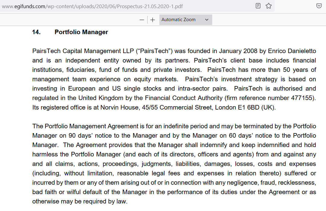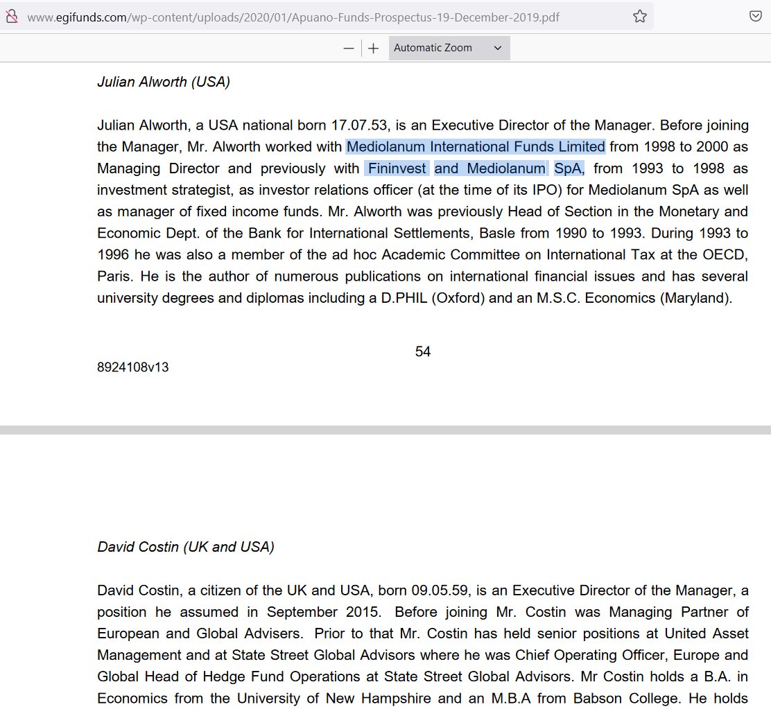 13/ We notice Pairstech is listed in the prospectus of an obscure fund management company called European and Global Investments (EGI), headed by an elusive US/Italian professor who worked for Fininvest, the holding company of Berlusconi, accused of money laundering & mafia ties.