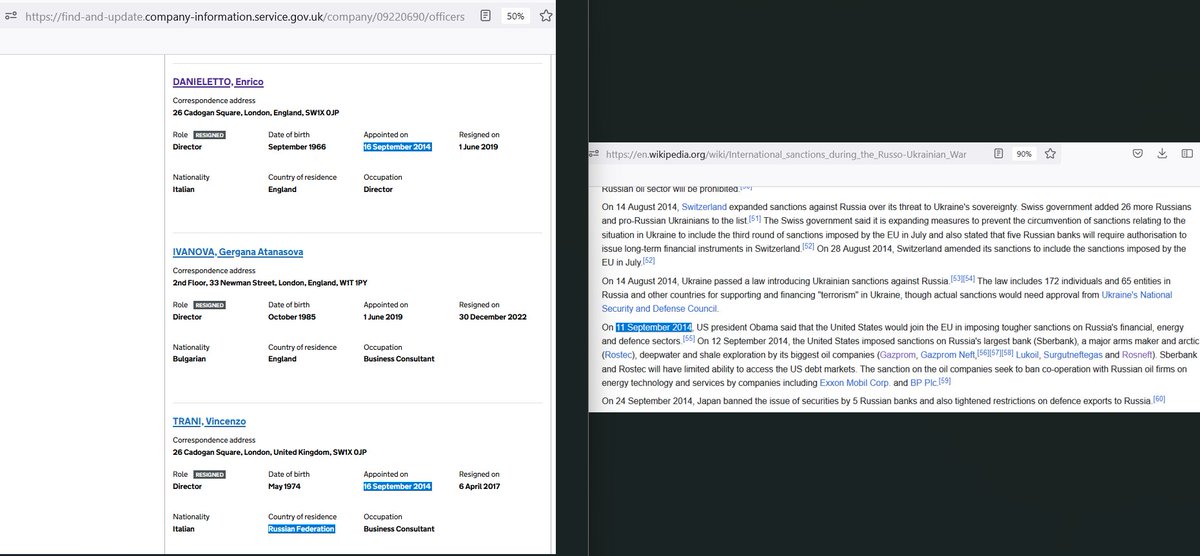 22/ Mignemi used to set up offshore companies & is well-connected (the son of a former French prime minister was on his board). So is Danieletto who set up a company with Vincenzo Trani (living in Moscow since 2001) 5 days after the US announced its heaviest Russian sanctions.