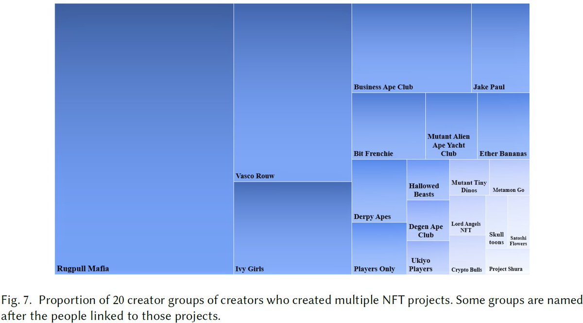3/ The paper identifies 20 groups of creators responsible for multiple rug pulls and even though it’s not complete (it doesn’t mention Mark Cuban’s rug pull factory with Jason Falovitch/Aaron Avruskin or the Squiggles scam ring), the pattern is quite clear