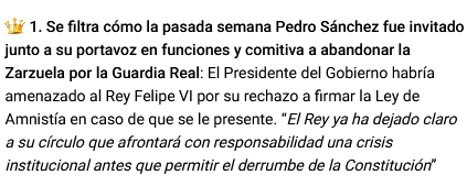 Alvise ha publicado que Felipe VI invitó al doctor Sánchez a abandonar el Palacio de la Zarzuela tras expresarle su rechazo a firmar una ley de "amnistía" a los separatistas catalanista.