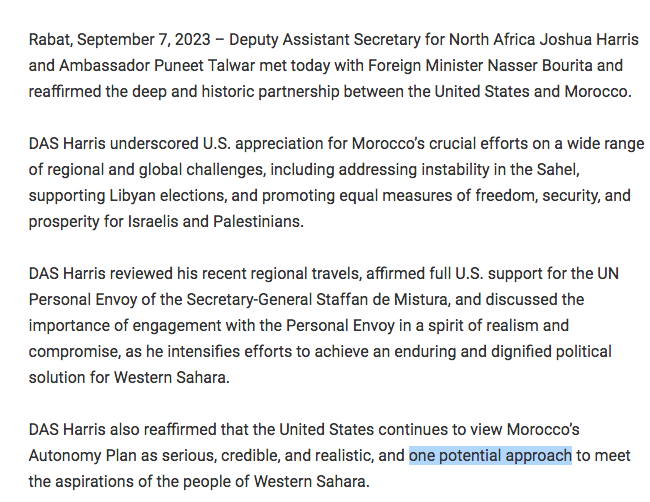 Estados Unidos, por enésima vez, y ahora en el mismo Rabat, se desvincula de la posición de Trump sobre el Sahara Occidental. La declaración de Joshua Harris el 7 de septiembre de 2023 es RADICALMENTE incompatible con la "proclamación" de Trump de 4 de diciembre de 2020
