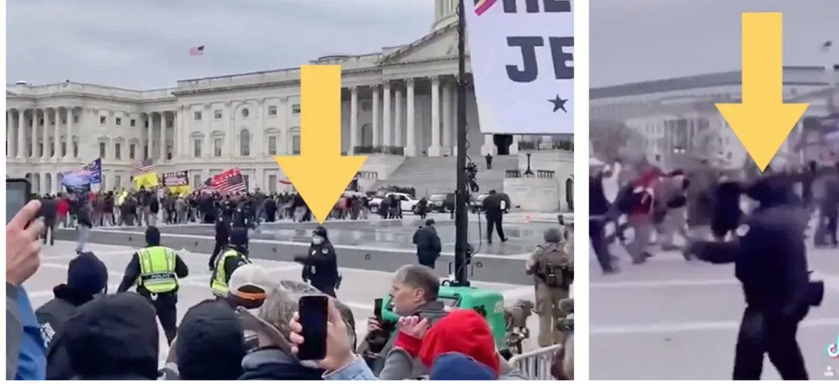 USCP Lt. John Jenkins said two of his officers, seen in the above image wearing yellow vests, had become separated from his platoon as the police fell back to the Capitol. Video shows him waving to them to get them to rejoin the line that had moved to the Capitol steps.