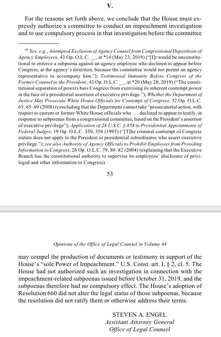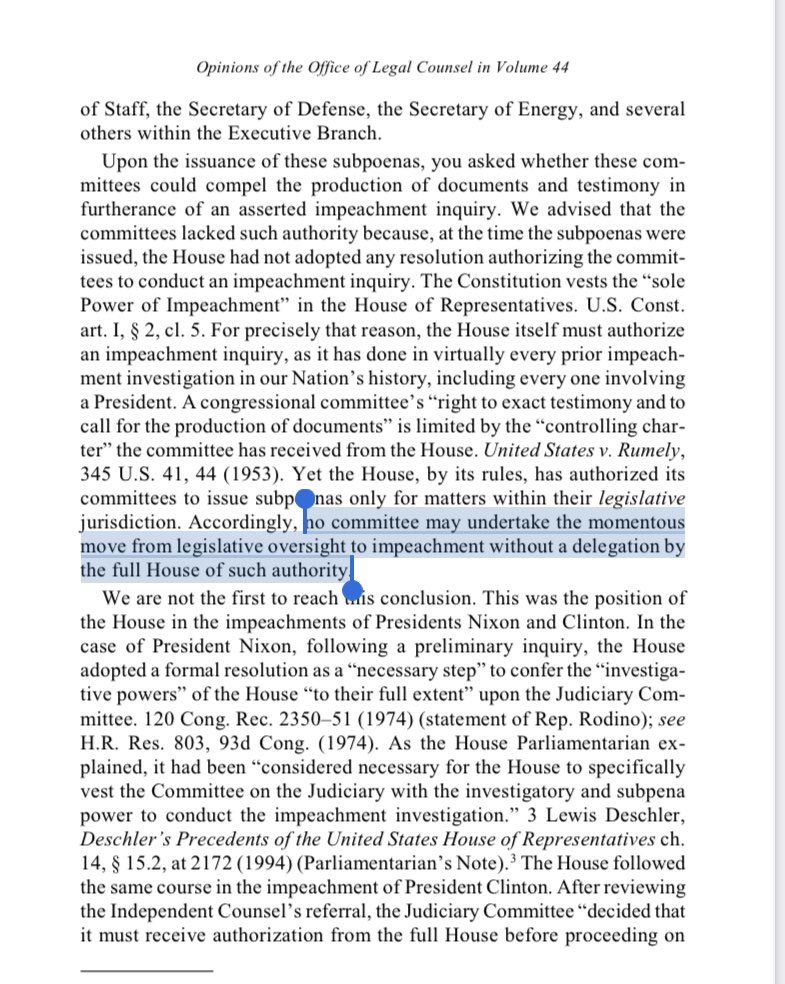 That opinion by the DOJ Office of Legal Counsel remains on the books and binds federal agencies (like DOJ and the FBI) from complying with the House’s impeachment-related subpoenas without a formal vote. politico.com/news/2023/09/1…