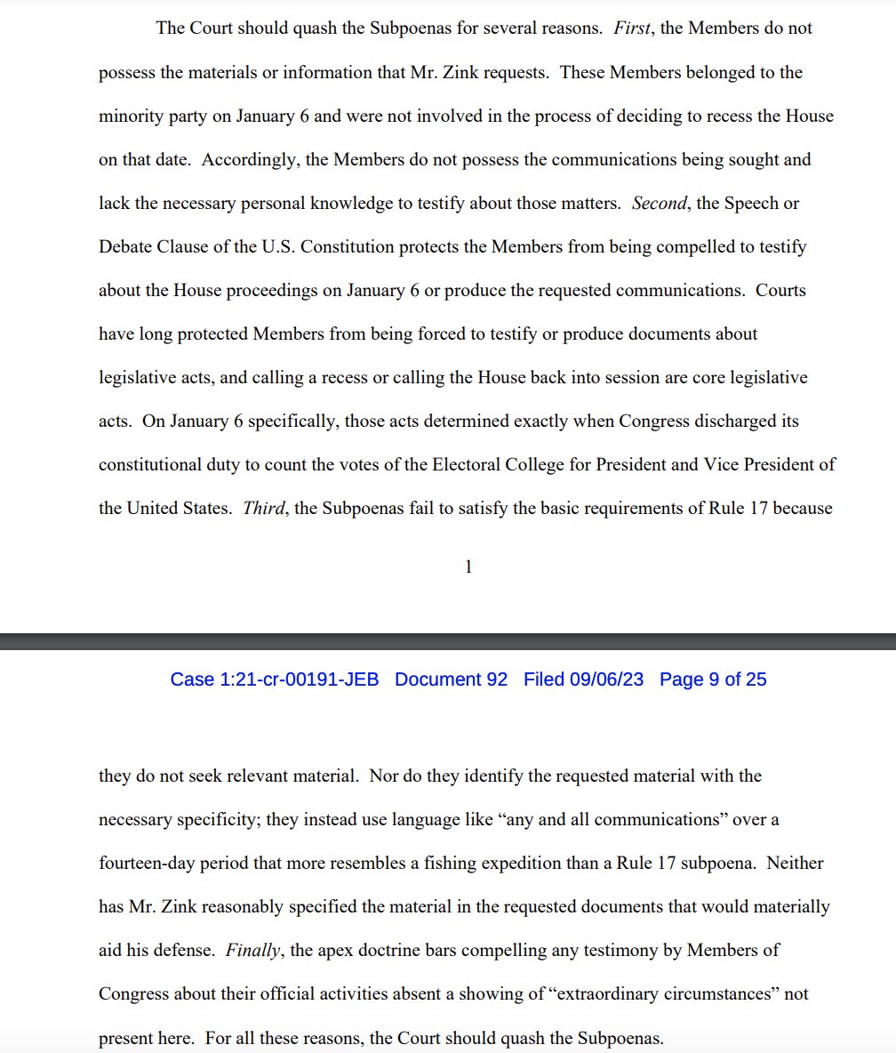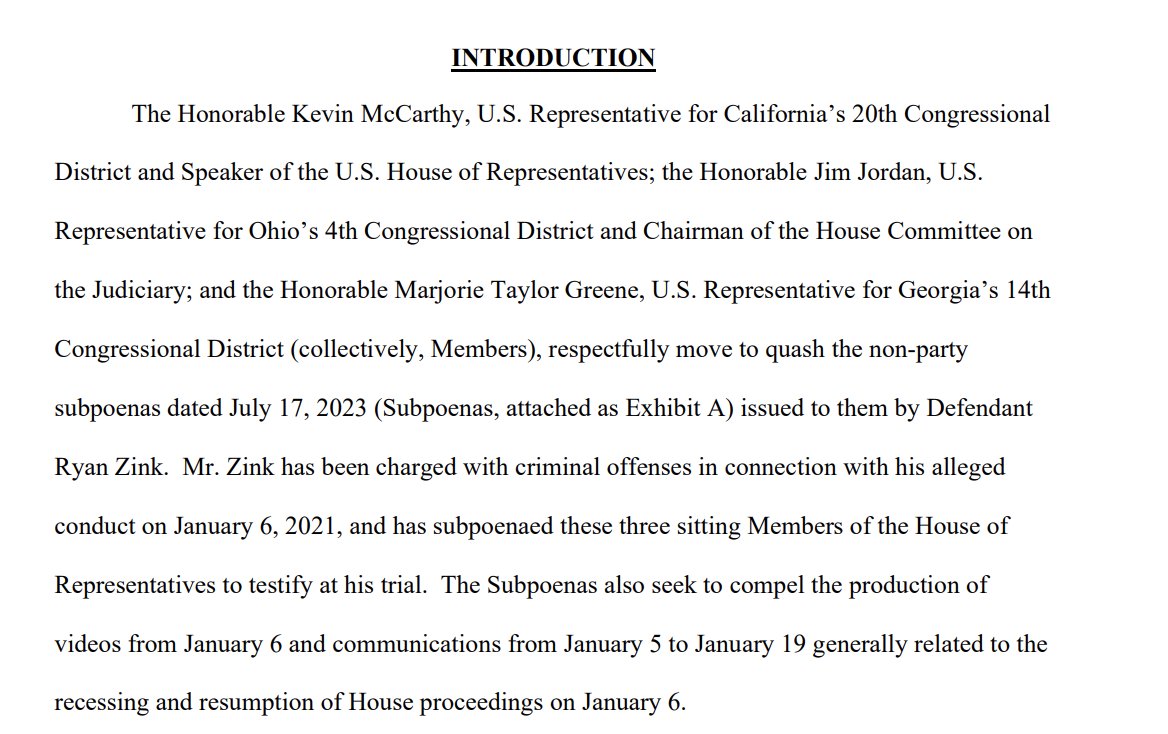 NOTABLY Zink tried to subpoena Speaker McCarthy, Rep. Jim Jordan and Rep. Marjorie Taylor Greene. Last week, House lawyers sharply (and successfully) rejected the effort, saying the subpoena was improper and sought irrelevant info. storage.courtlistener.com/recap/gov.usco…