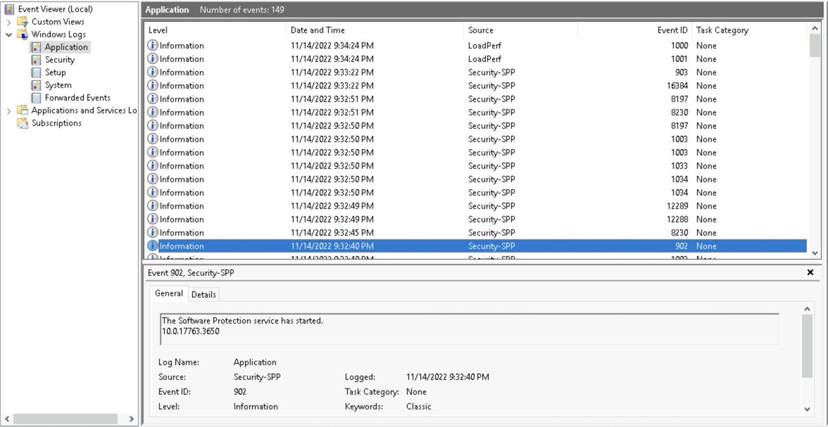 Skimming through the Application Logs - we can for example see Events with an ID of 902 - Software Protection Service started
