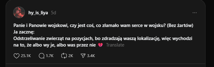 "Panie i Panowie wojskowi, czy jest coś, co złamało wam serce w wojsku? (Bez żartów) Ja zacznę: Odstrzeliwanie zwierząt na pozycjach, bo zdradzają waszą lokalizację, więc wychodzi na to, że albo wy je, albo was przez nie 💔"