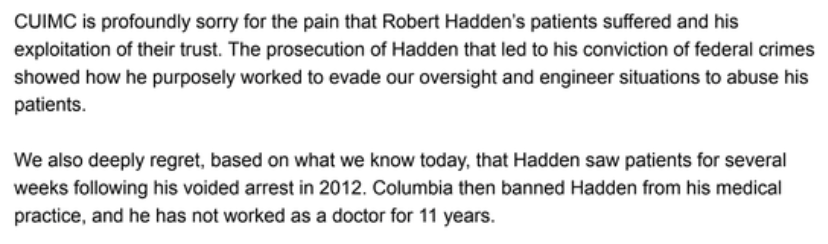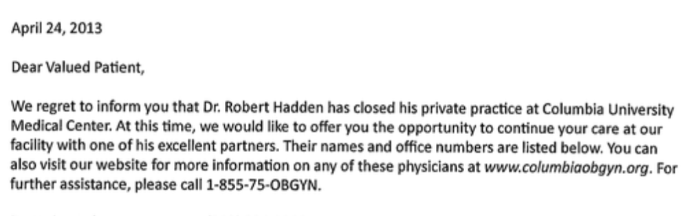 @Columbia @nyphospital 3/ In April 2013, Columbia sent a mass mailing to patients, advising them that Hadden had “closed his private practice” at Columbia. But the letter failed to say why.