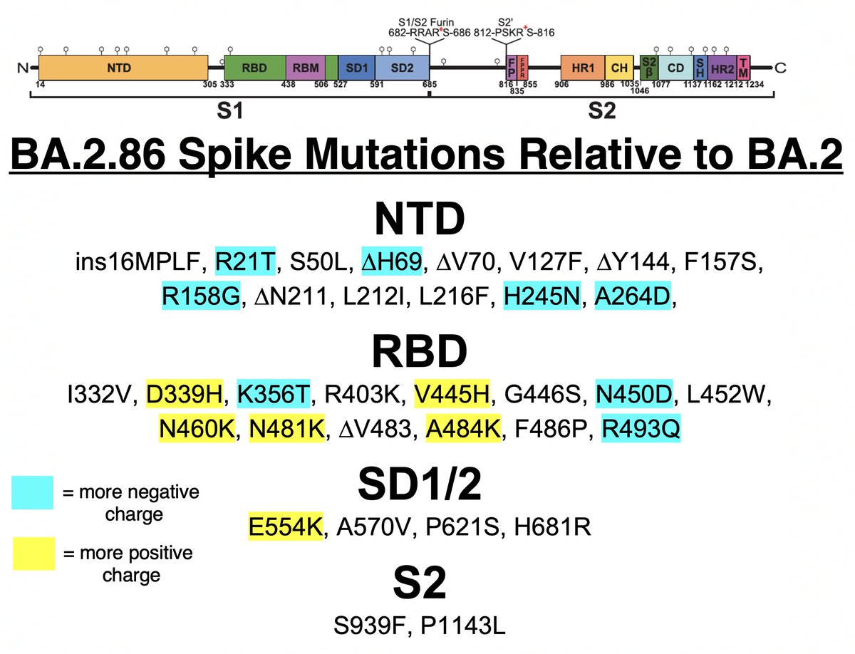 One observation—most likely inconsequential but I think curious enough to at least mention—is that BA.2.86 has a more negatively charged NTD relative to BA.2, while its RBD is somewhat more positively charged. 2/3