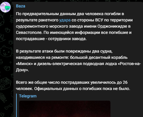 Baza says the two damage ships/subs were the Black Sea Fleet's Rostov-on-Don Project 636.3 diesel submarine and Baltic Fleet's Minsk Project 775 Ropucha-class large landing ship. 9/ t.me/bazabazon/21385
