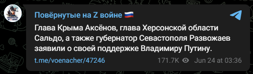 Before this, certain Russian Telegram channels could side with Prigozhin because the conflict was between him and the MoD. It is now with Putin. Siding with Prigozhin now is much more dangerous, and it comes at a time when the Russian military is facing a Ukrainian offensive. 2/
