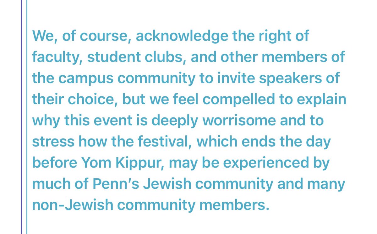 @Penn There is also no acknowledgment of the insensitive, callous timing during the Days of Awe, w/antisemites scheduled to speak on the campus just a day before Yom Kippur. 😩 This was a key concern of @TheAENetwork faculty @Penn ⬇️⬇️ (but apparently not the administration). Sad. 😢😢