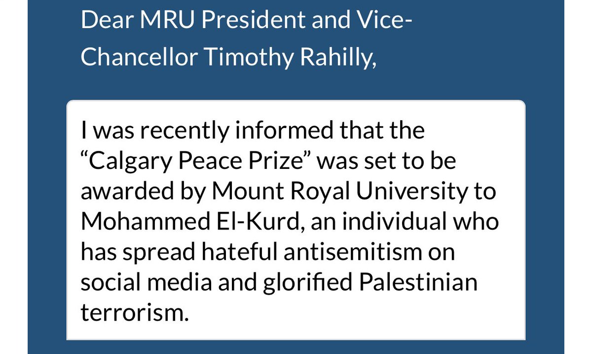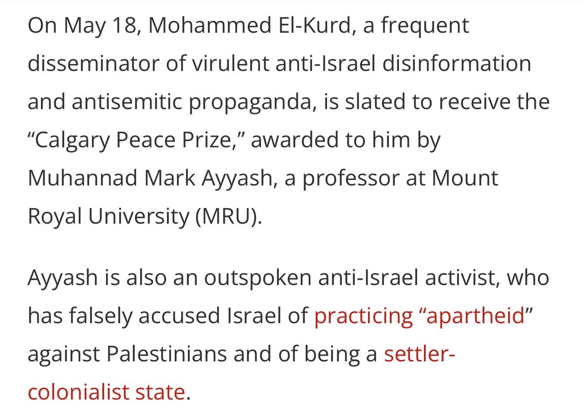 Shocker: the author of this latest Al Shabaka article is the same faculty member @mountroyal4u who bestowed this year’s Calgary Peace ☮️ Prize on a virulent anti-🇮🇱 propagandist who traffics in #antisemitic tropes & canards.