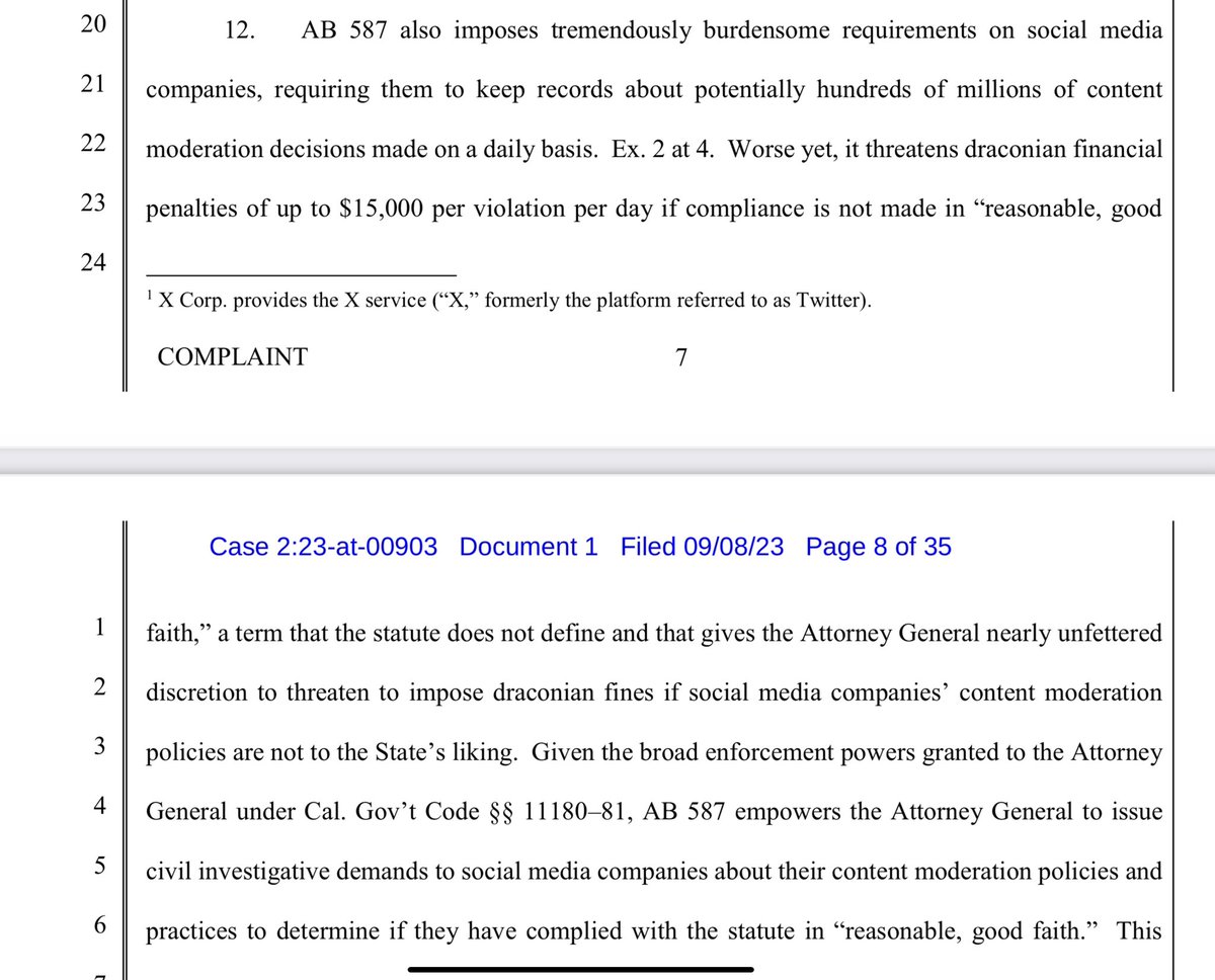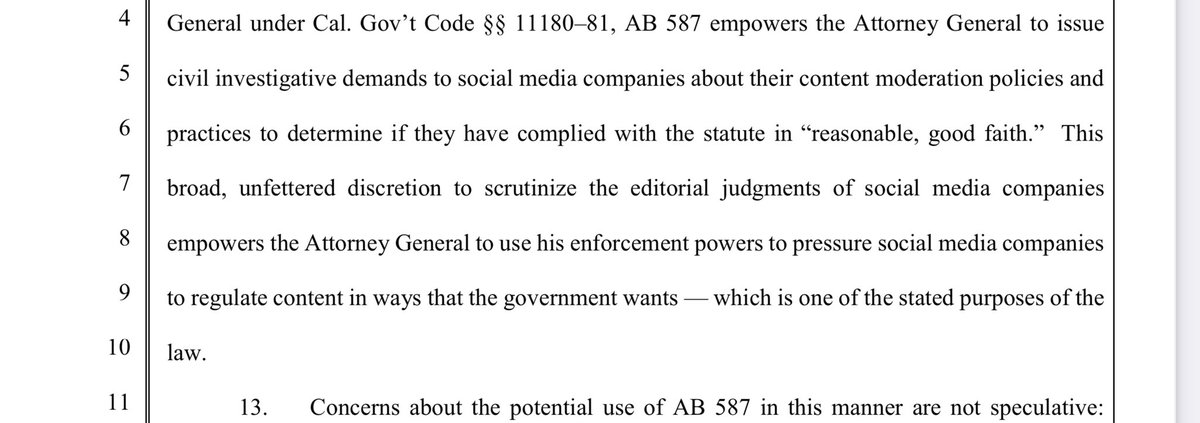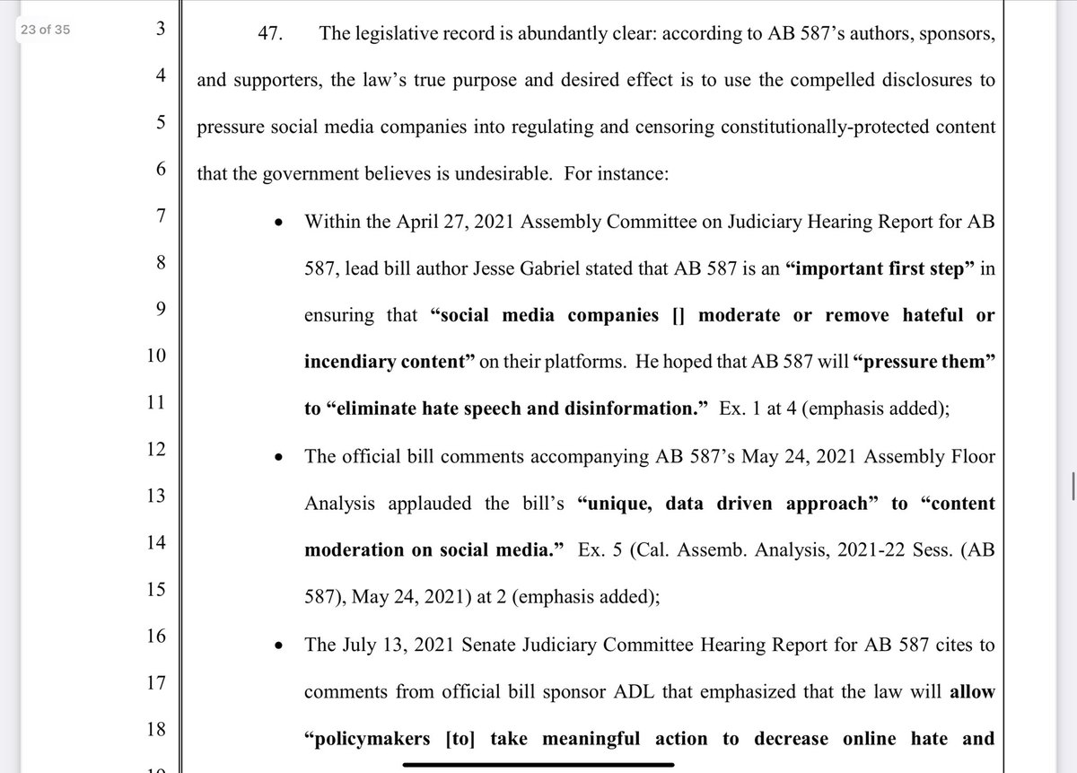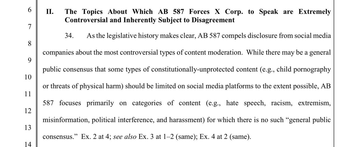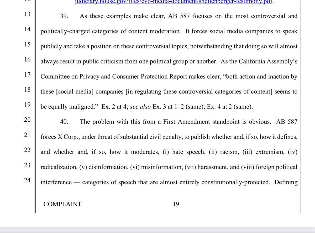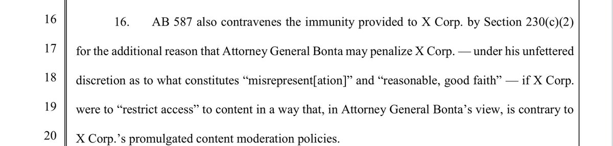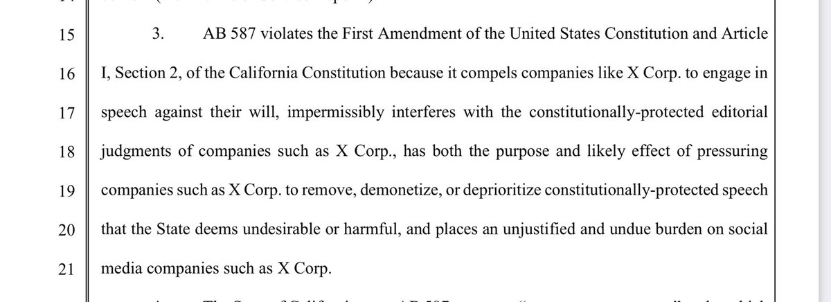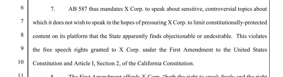 X stands for the 1st Amendment here- both for themselves, and for you and I. There hasn’t ever been a social media company who has done this, as evidenced in Missouri v. Biden. X states that this law violates the 1st amendment of both the Federal and CA state constitution. It stifles THEIR right to free speech, and also has the purpose of pressuring companies to remove, demonetize, and deprioritize CONSTITUTIONALLY PROTECTED SPEECH.