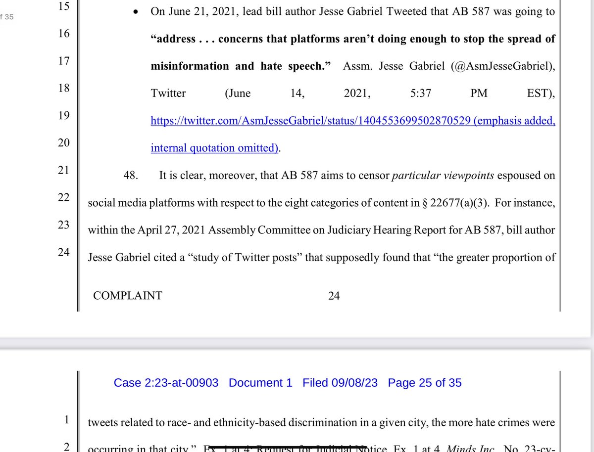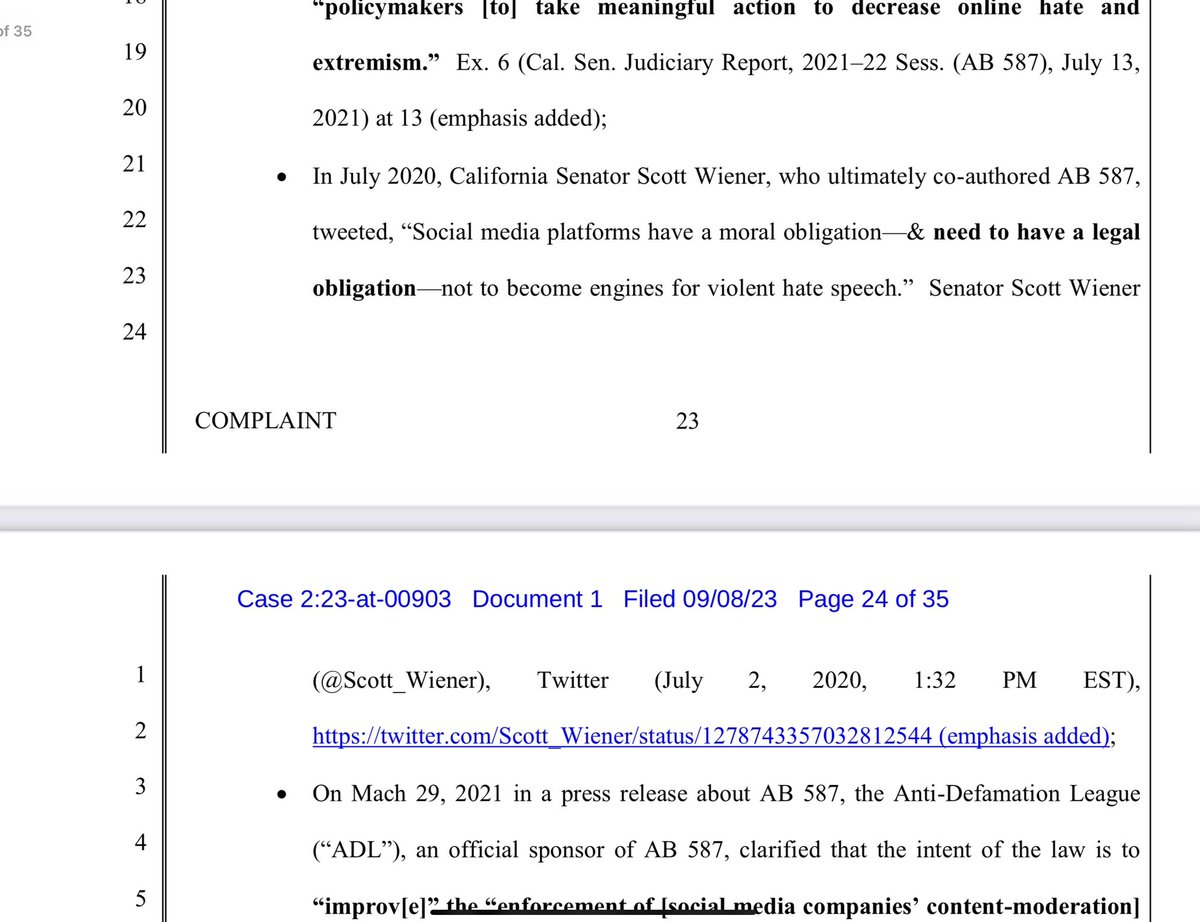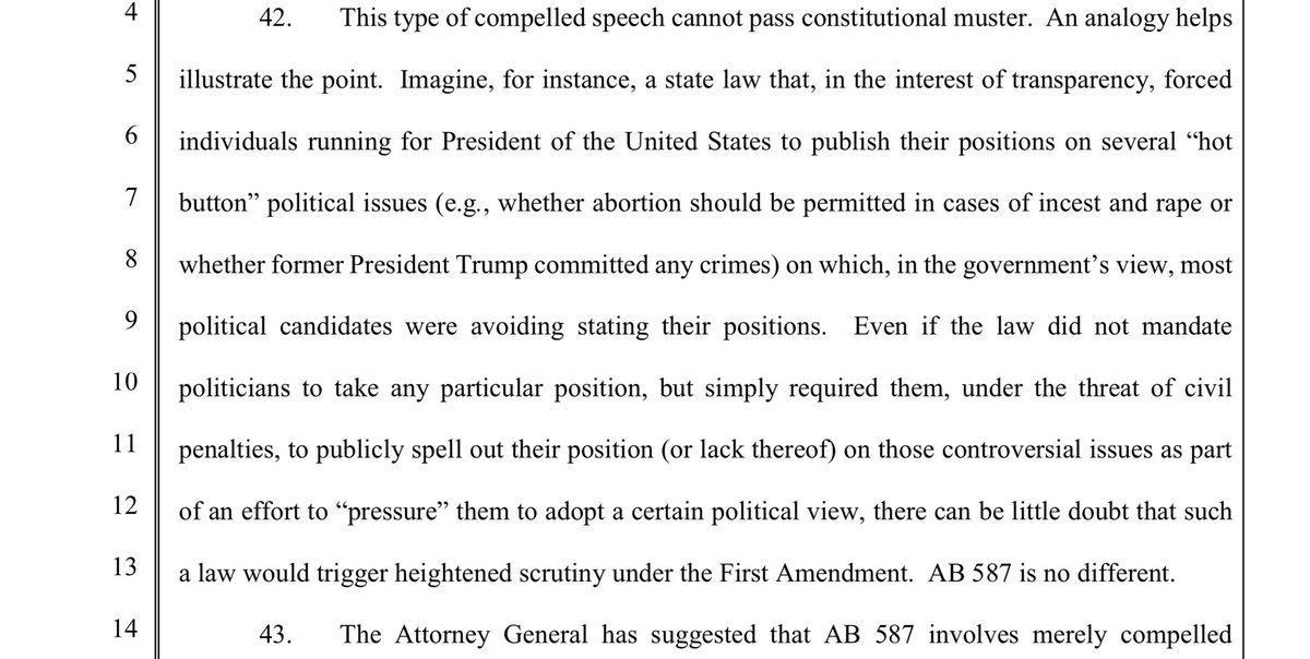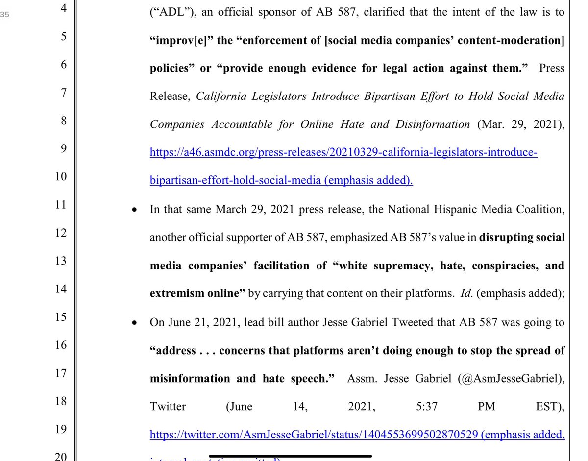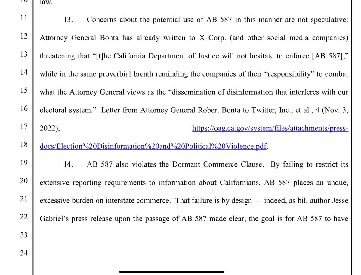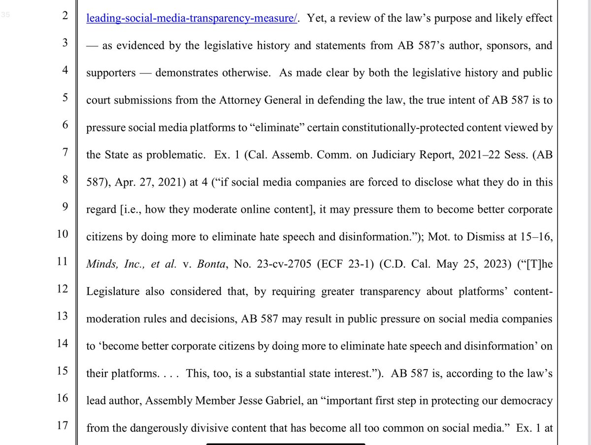 X stands for the 1st Amendment here- both for themselves, and for you and I. There hasn’t ever been a social media company who has done this, as evidenced in Missouri v. Biden. X states that this law violates the 1st amendment of both the Federal and CA state constitution. It stifles THEIR right to free speech, and also has the purpose of pressuring companies to remove, demonetize, and deprioritize CONSTITUTIONALLY PROTECTED SPEECH.