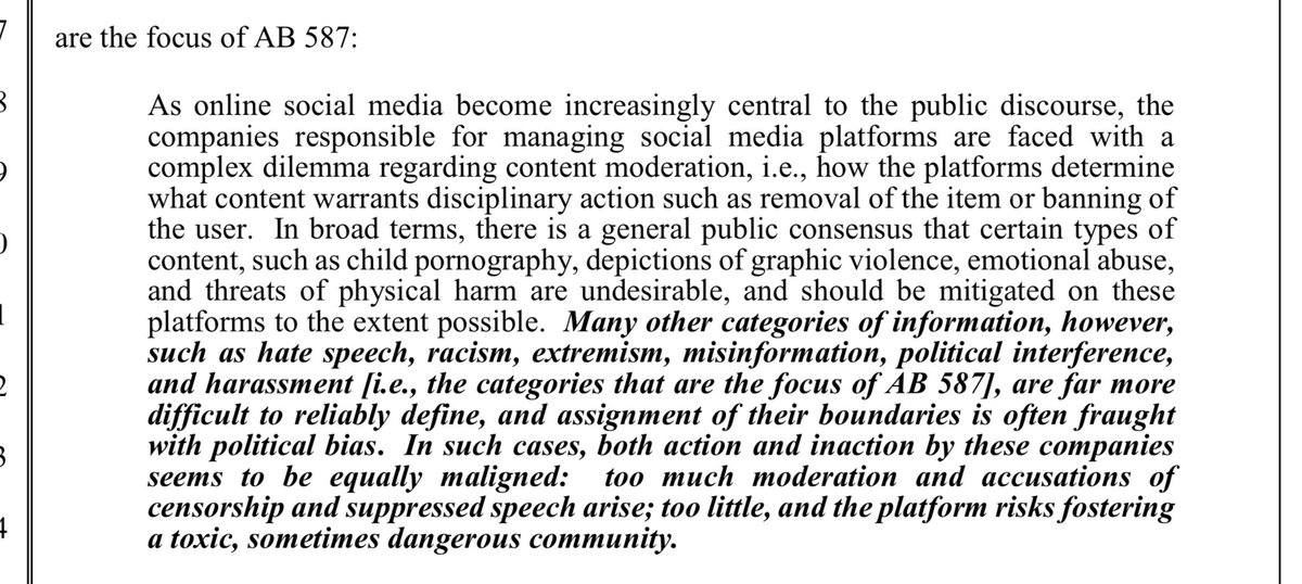 The Assembly reports on the bill lay out how difficult it is given the importance of social media- generally accepted for removal are the ones you would expect; however, other categories like “misinformation” are politically charged and biased, and coming up with policy for them is extremely difficult.