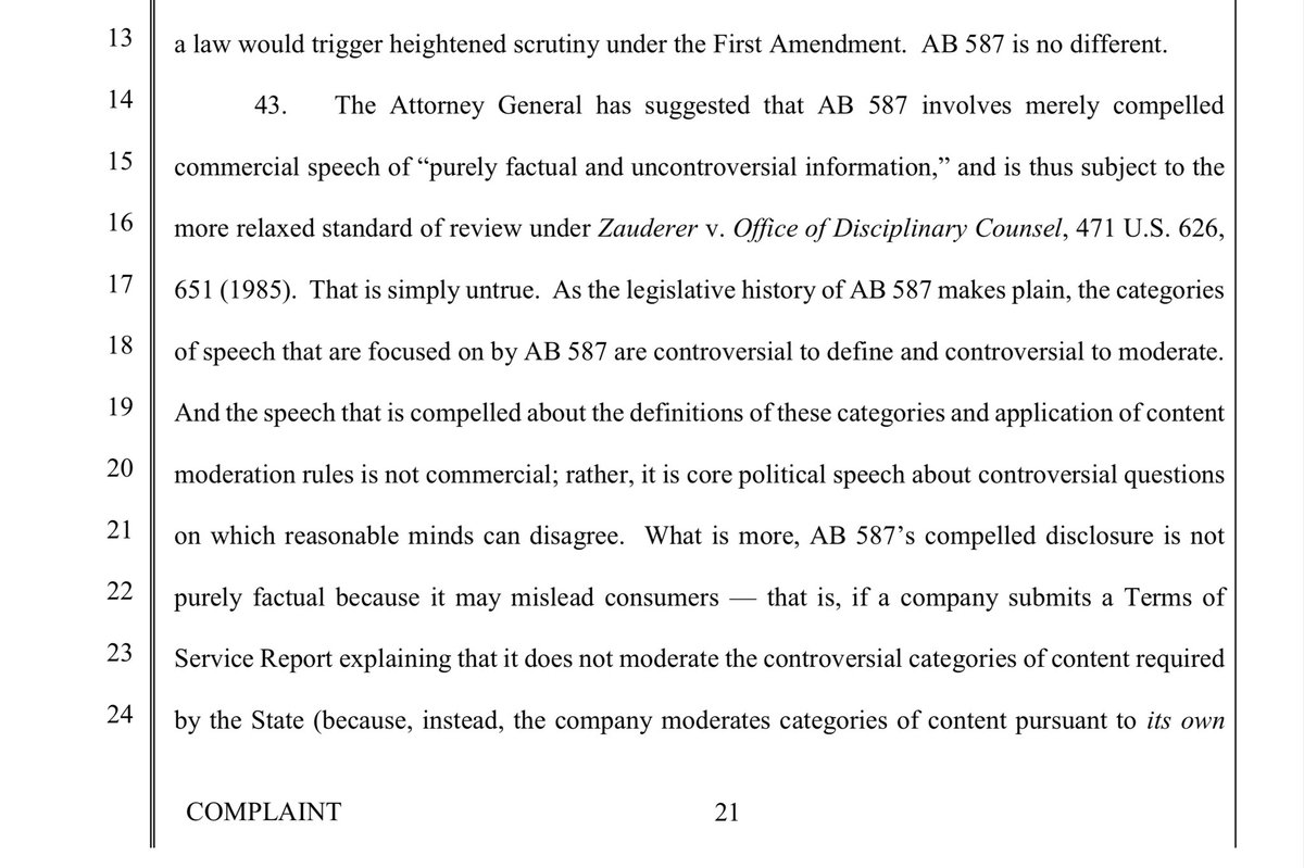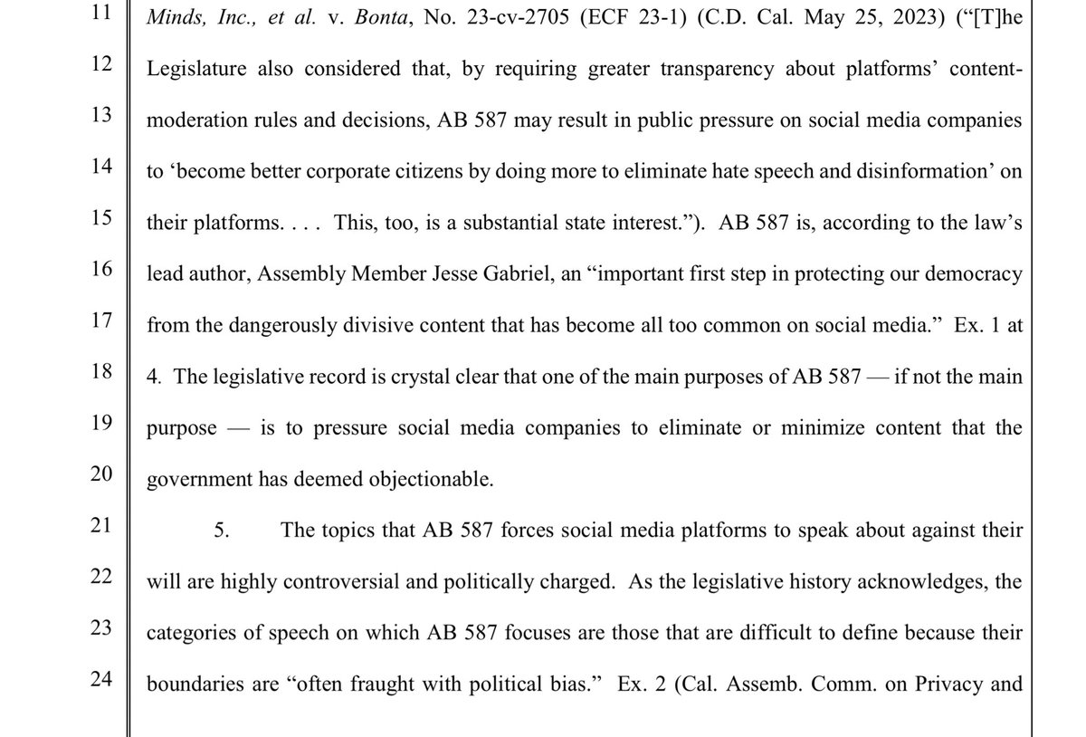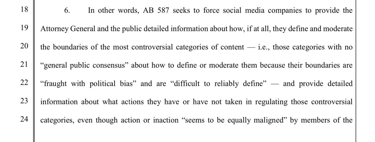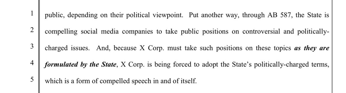 “Put another way, though AB 587, the State compelling social media companies to take public positions on controversial and politically charged issues. And because X Corp must take such positions on these topics AS THEY ARE FORMULATED BY THE STATE, X Corp is being forced to adopt the State’s politically charged terms, which is a form of compelled speech in and of itself..” (Emphasis added, sort of.)