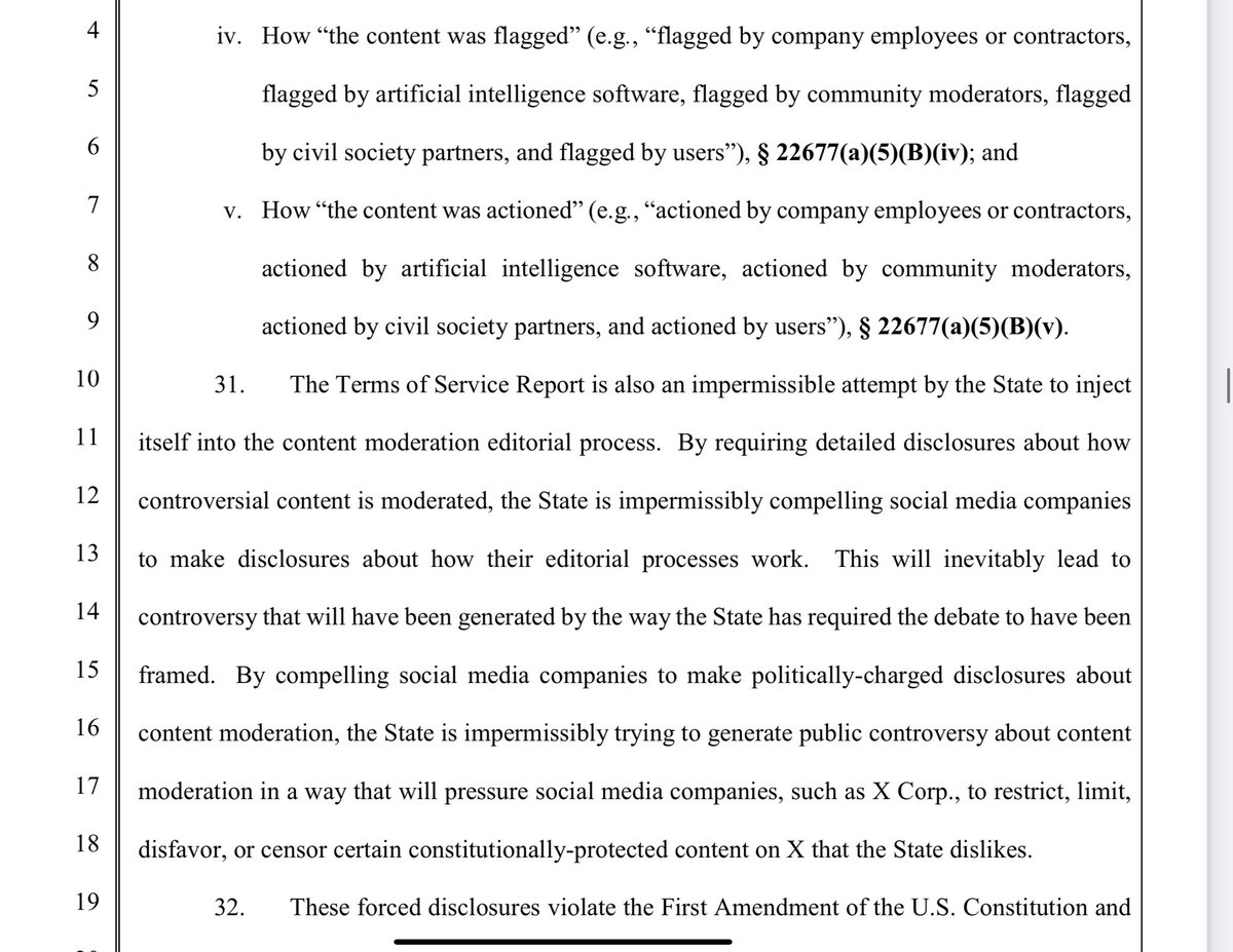 They tout the bill as a “transparency” measure, but in actuality, says X in filings, the laws true intent is to “eliminate” certain constitutionally protected content the STATE views as “problematic.”