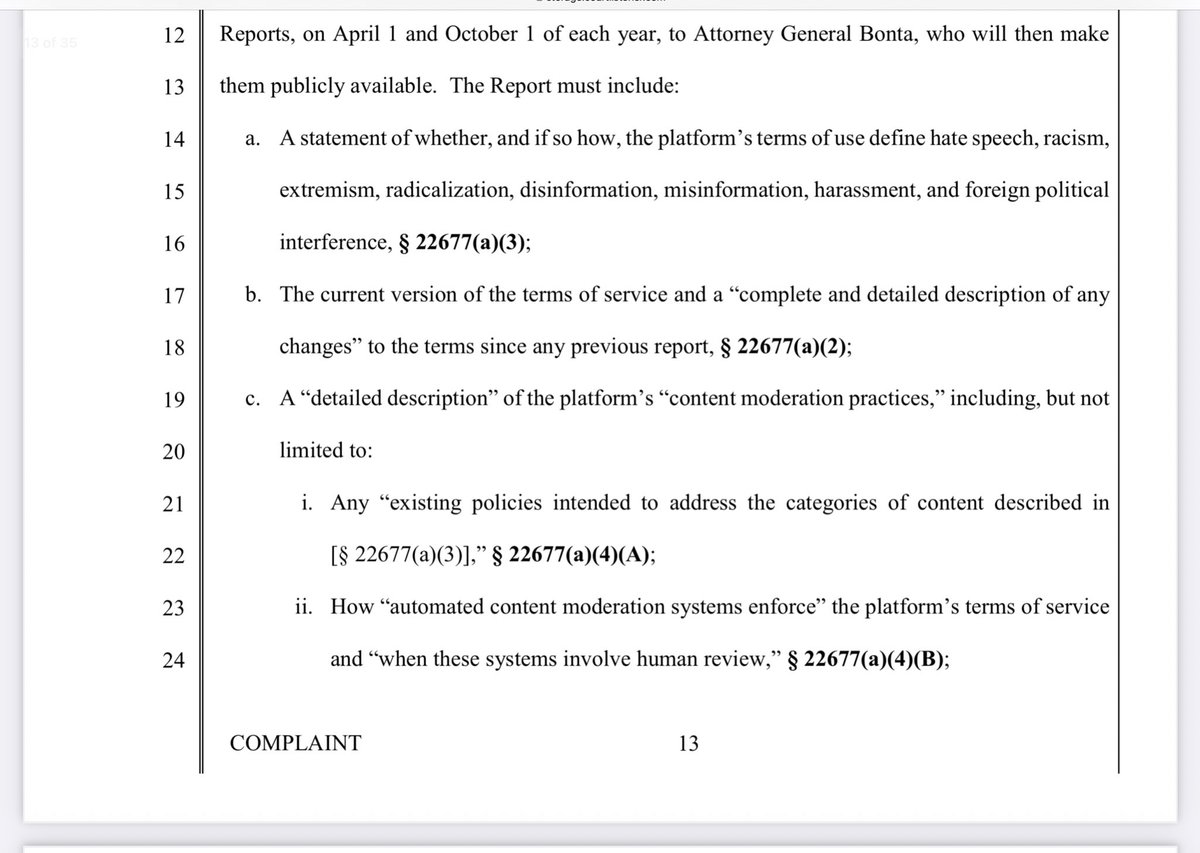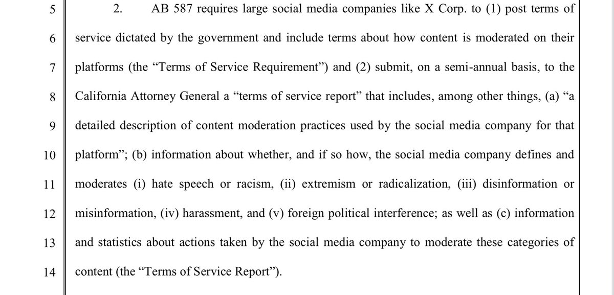 X is challenging AB 587, which requires large social media companies to post their TOS as dictated by the government, and submit a report to the AG (a law enforcement officer) that provides: