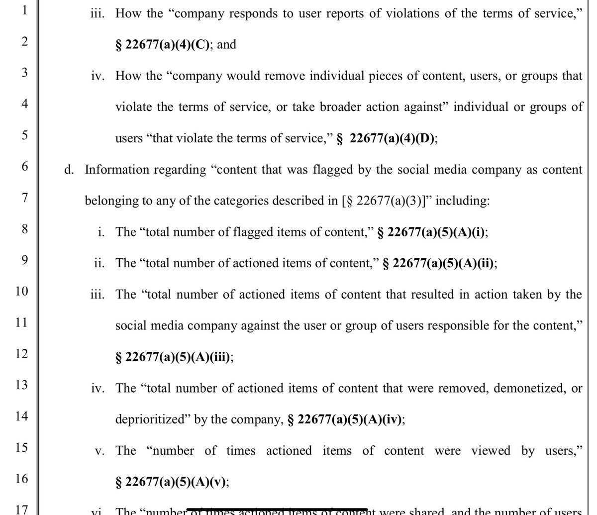 This is pretty insane - they will FINE these companies $15k PER DAY if the government judges them to be in violation.. My question is how California thinks they will KNOW if a PRIVATE company withholds certain data, and herein lies the issue. What if X or Meta misrepresent the number of folks banned, lets say? Are they going to have a running subpoena or agent INSIDE to know??