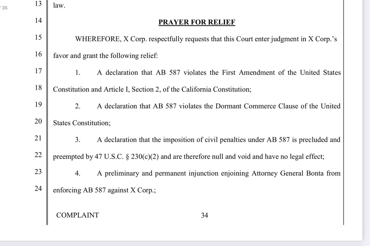 So, X is suing for violation of the First Amendment, Declaratory Relief and Permanent Injunctive Relief for violation of the dormant commerce clause of the Constitution, as well as relief for immunity under preemption by Section 230, and this: