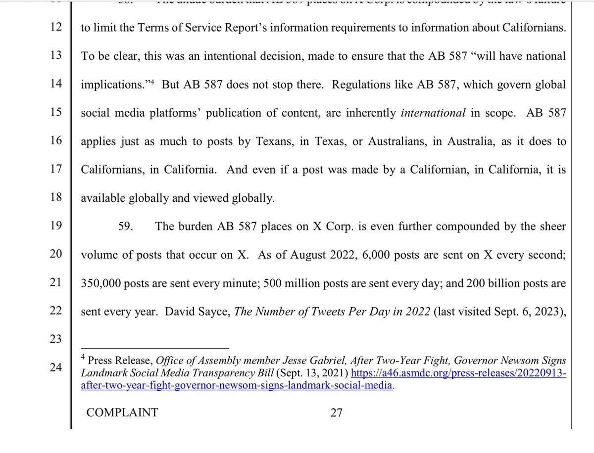 And its global in scope, because what someone in CA sends is visible by someone in Australia. This makes compliance impossible and ridiculously expensive.. There are 200 BILLION posts on X per year.