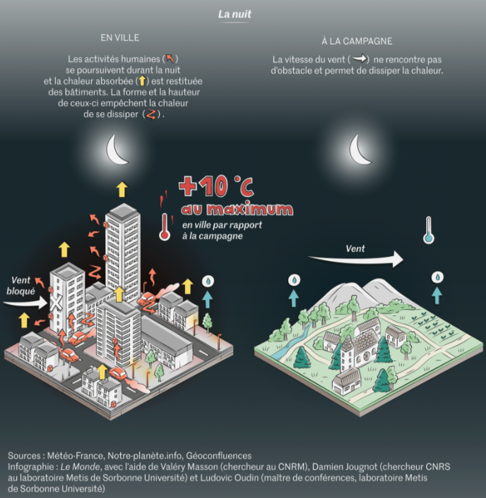 Si la chaleur baisse la nuit, les centres-urbain ne peuvent pas bénéficier des mêmes phénomènes d'aérations qu'en campagne.