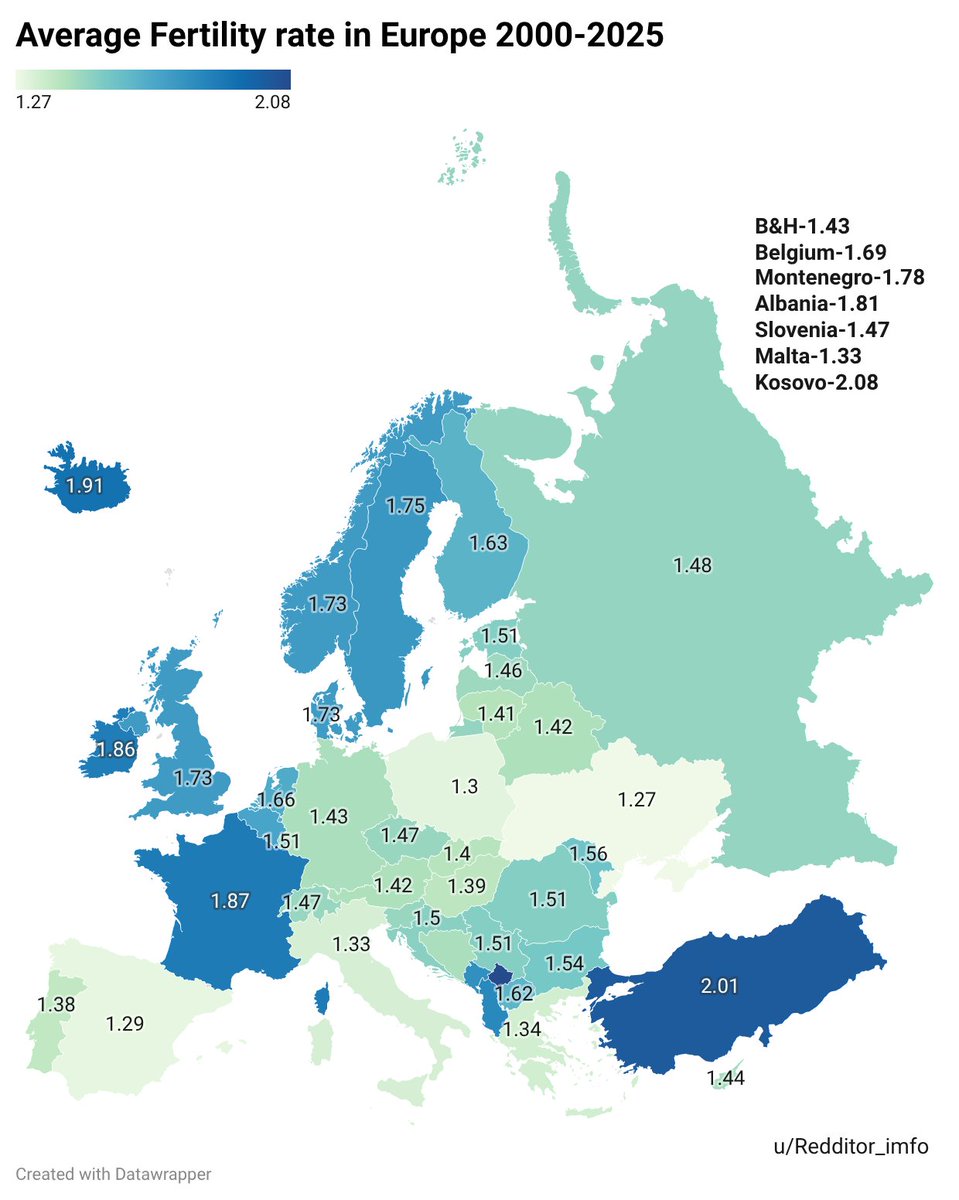 Most western European countries, including the UK, France, Germany and Italy haven't had replacement fertility in more than 50 years.