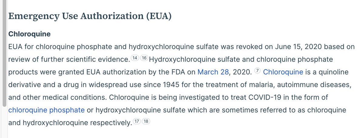 it lists hydroxychloroquine in the "COVID-19 potential treatments and interventions" table, and although it mentions the EUA was revoked, states that it is "being investigated to treat COVID-19"