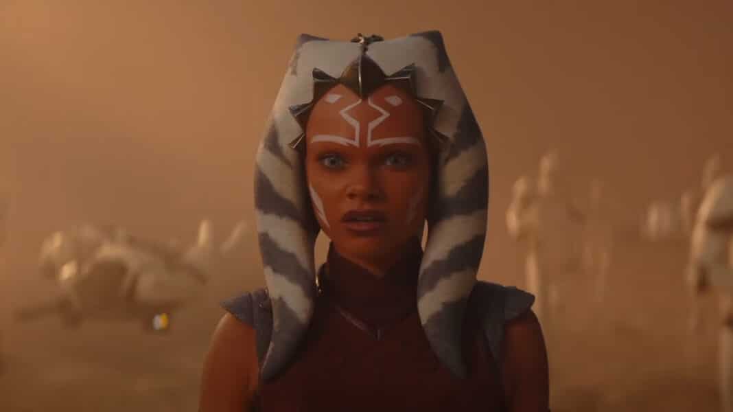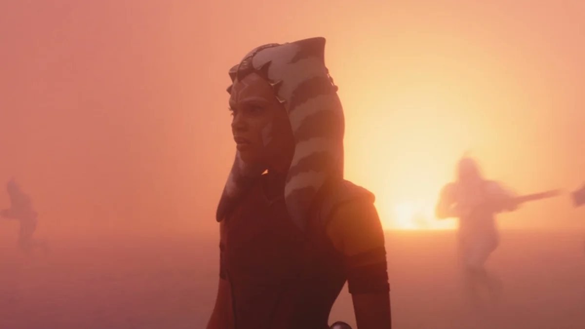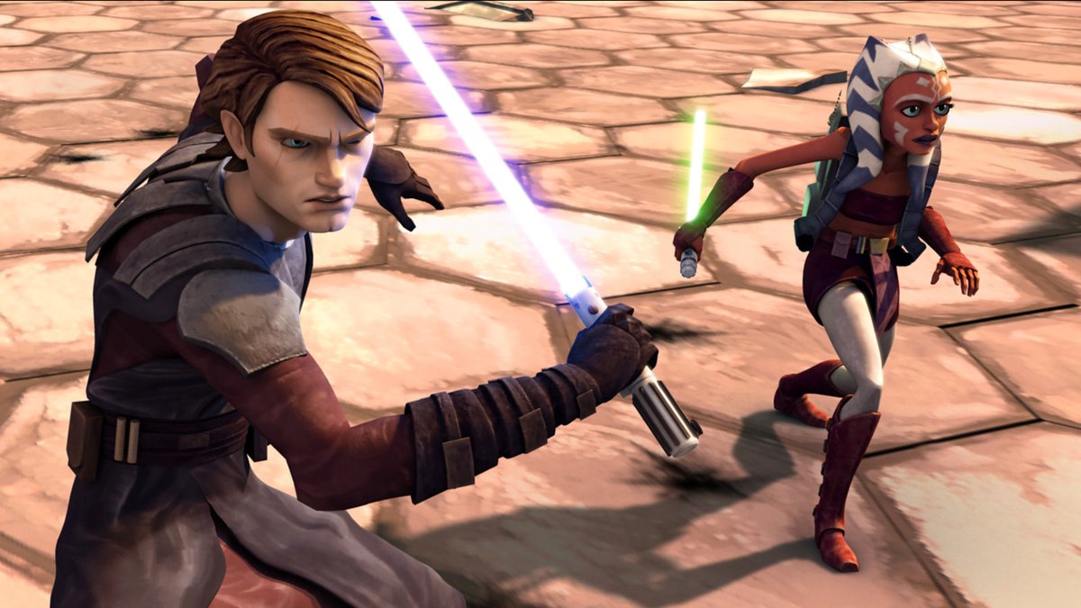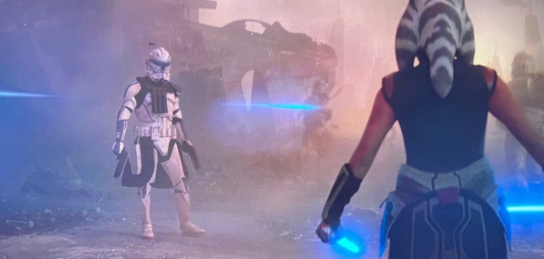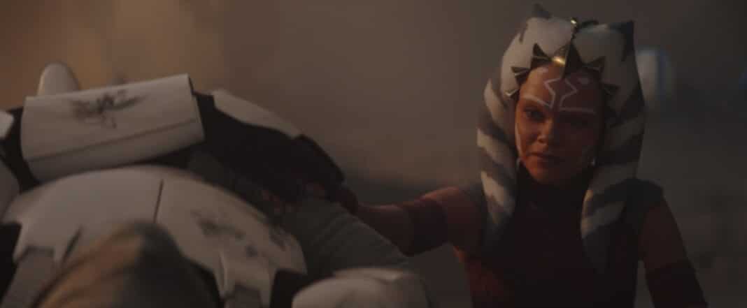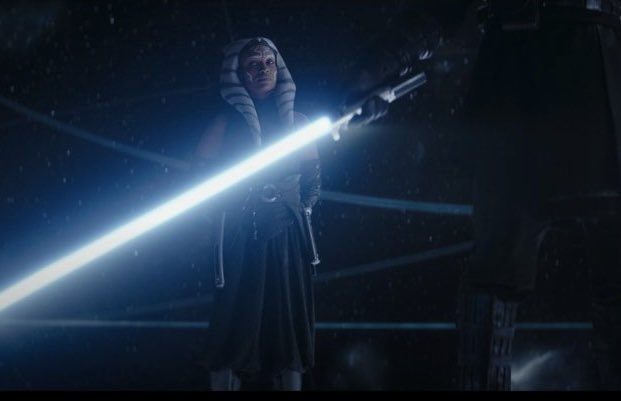 - Vemos Cañoneras LAAT, los caminantes AT-TE, los rifles bláster DC-15A, las carabinas bláster DC-15S. Ahsoka también está vestida igual que su primer diseño en The Clone Wars, cuando tenía 14 años. También vemos su primer sable láser de hoja verde y la coleta padawan