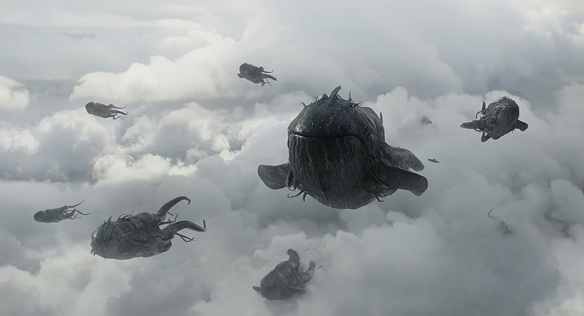 La escena recuerda a Gandalf el Blanco y las Águilas de "El Señor de los Anillos" y por supuesto al gusano espacial de "El Imperio Contraataca"