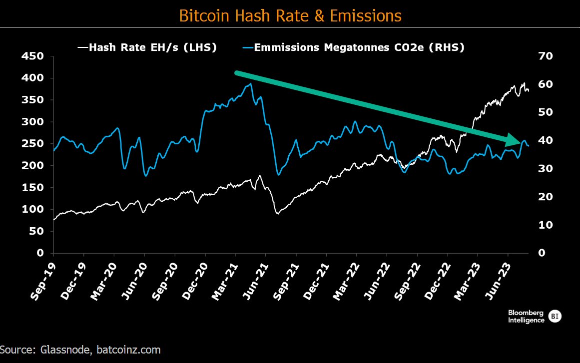 👉Despite 4x Hashrate, carbon emissions (blue) are only⬆️6.9% since 2019