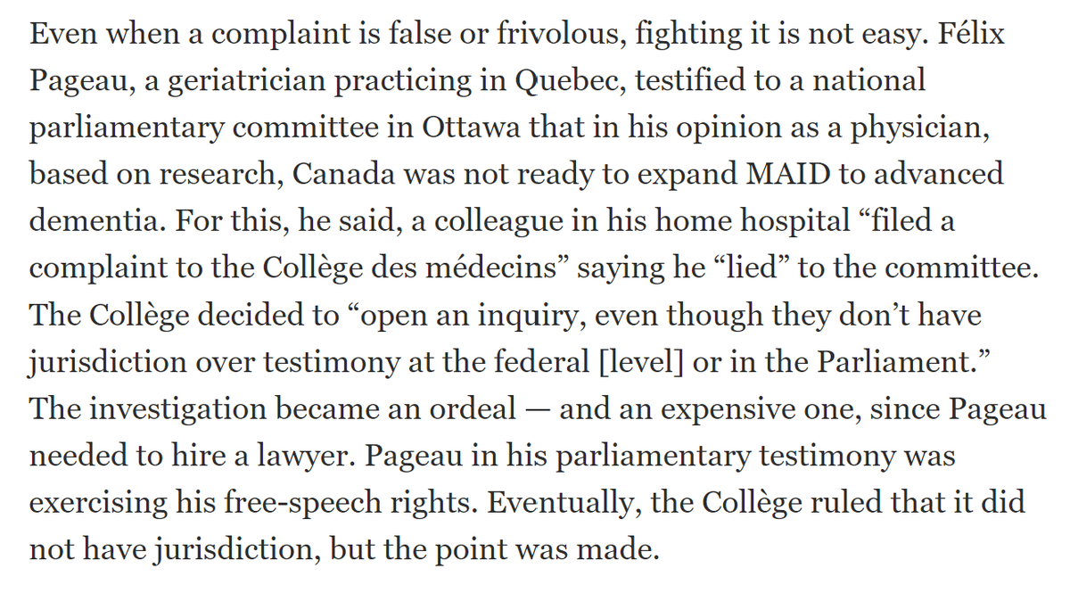 A physician in Quebec was even targeted by his medical college... for his testimony to a parliamentary committee warning about the dangers of expanding MAID.