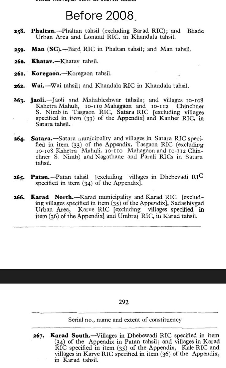 Before 2008 delimitation, Satara Lok Sabha included 6 assembly segments - Phaltan, Man, Khatav, Koregaon, Wai and Satara. After the 2008 delimitation, Phaltan is part of the Madha Lok Sabha. Man and Khatav were unified to form the Man assembly.