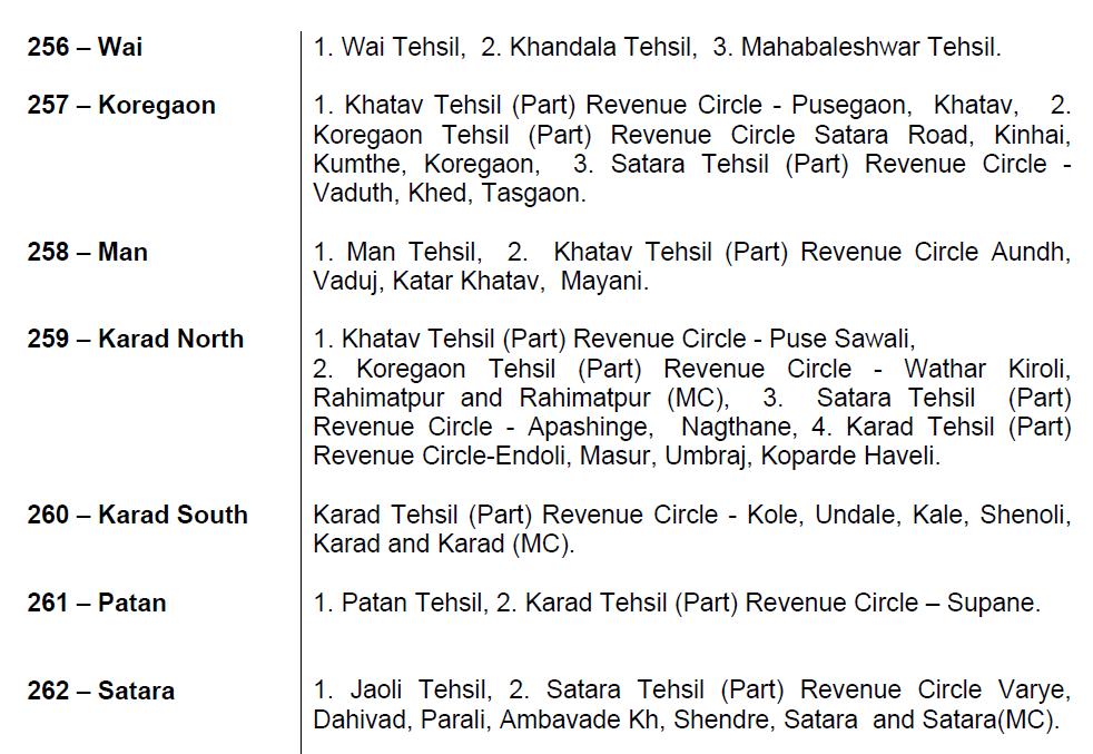 Satara Lok Sabha consists of 6 Vidhan Sabha Segments - 1) Wai, 2) Koregaon, 3) Karad North, 4) Karad South, 5) Patan and 6) Satara.