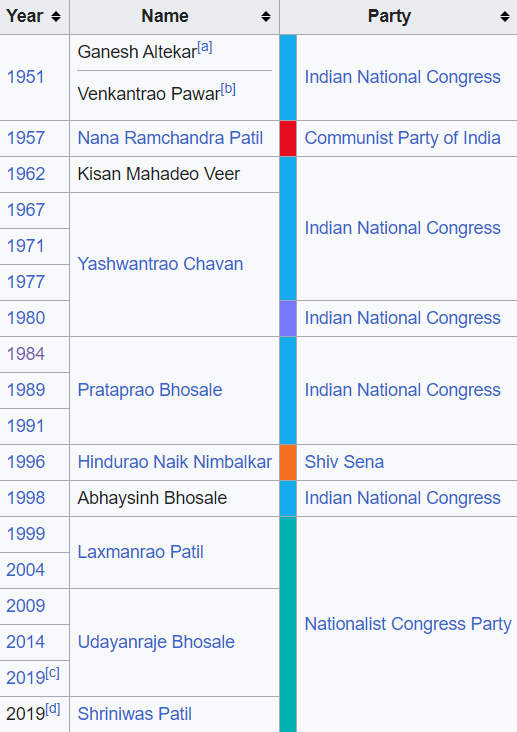 In 1957 Nana Patil of CPI won the elections. In 1962, Kisan Mahadev Veer of INC won. Yashwantrao Chavan won 1967, 1971 and 1977 in one-sided contests.