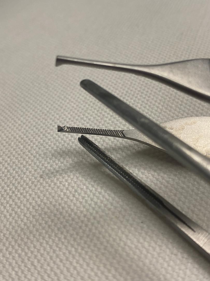 On the R are DeBakey and Adson forceps. Each of these has hatchings on the ends that help them grab tissue (and also needles).