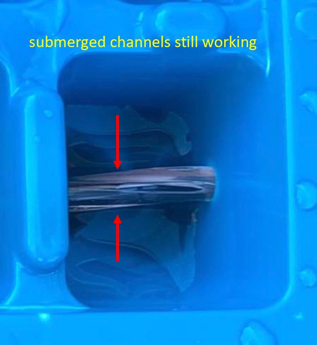 It has 4 channels that are separated from each other...essentially it is 4 drains that happen to be all in the same tube. The channels that were submerged were still working.