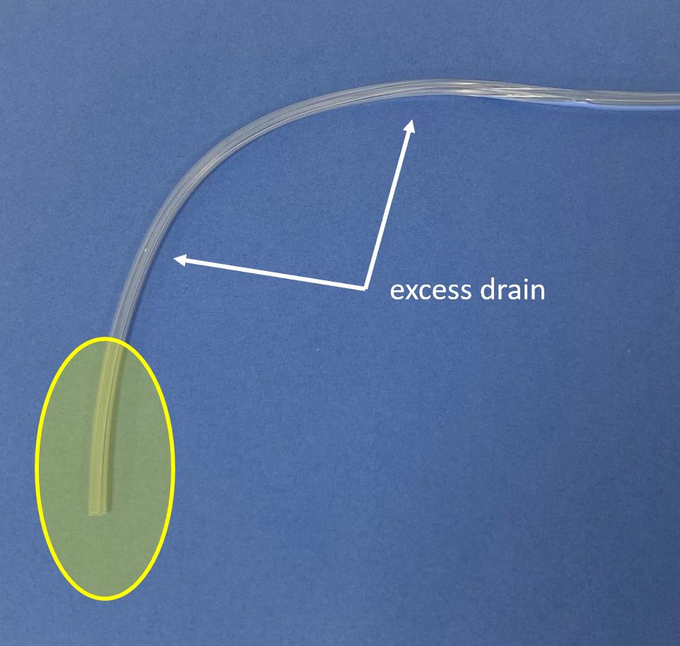 In the L picture, the area of interest (yellow) is small, and there is a lot of excess tubing. On the R the drain is trimmed to a more suitable length.